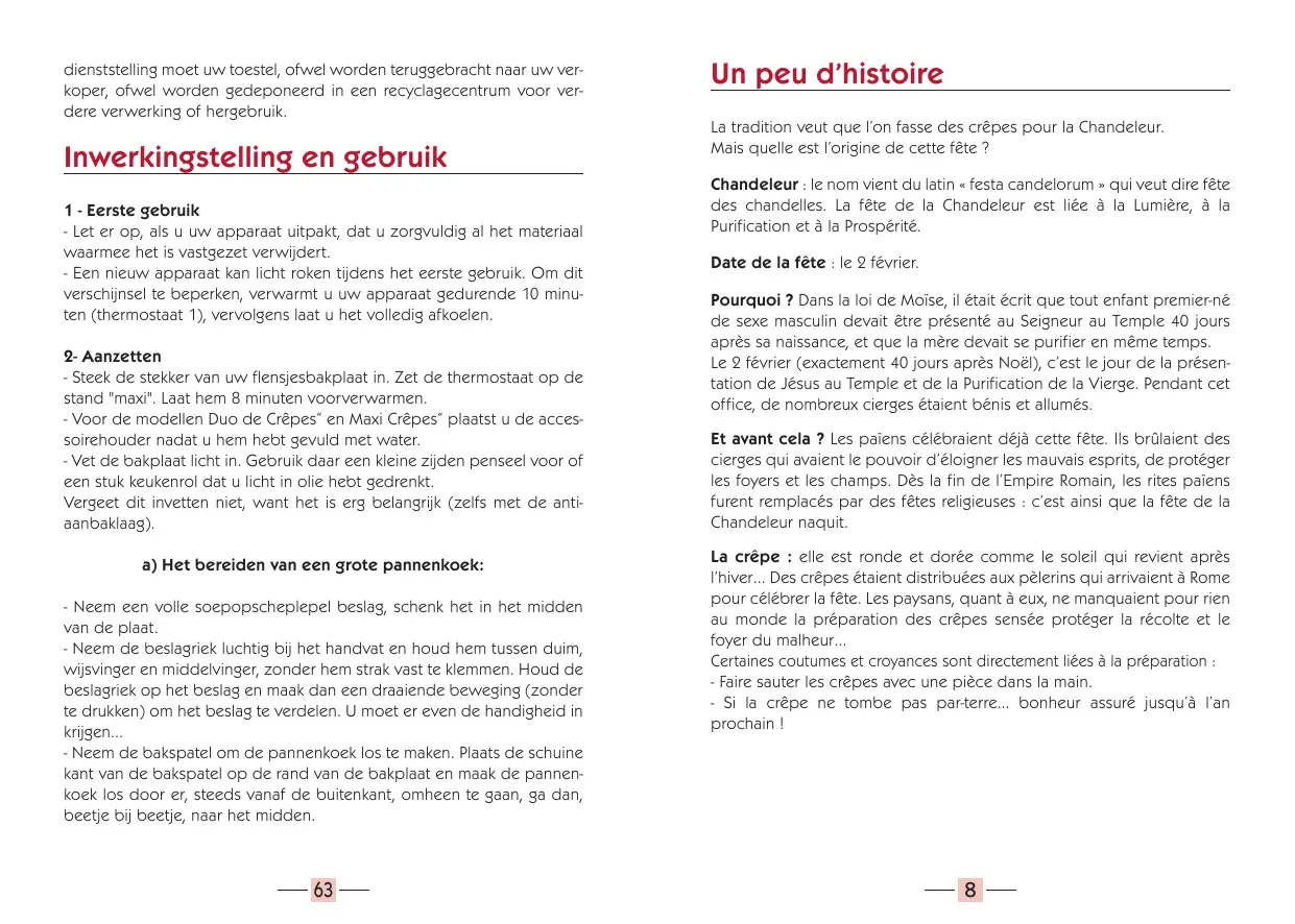 La garantie légale due par le vendeur n’exclut en rien la garantie légale due par le Constructeur pour défauts ou vices de fabrication selon les articles 1641 et suivants du code Civil. En cas de panne ou dysfonctionnement, adressez-vous à votre revendeur. En cas de défectuosité technique dans les 8 jours suivant l’achat, les appareils sont échangés. Après ce délai ils sont réparés par le serviceaprès-vente LAGRANGE. Un peu d’histoire La tradition veut que l’on fasse des crêpes pour la Chandeleur. Mais quelle est l’origine de cette fête ? Chandeleur : le nom vient du latin « festa candelorum » qui veut dire fête des chandelles. La fête de la Chandeleur est liée à la Lumière, à la Purification et à la Prospérité. Date de la fête : le 2 février. Pourquoi ? Dans la loi de Moïse, il était écrit que tout enfant premier-né de sexe masculin devait être présenté au Seigneur au Temple 40 jours après sa naissance, et que la mère devait se purifier en même temps. Le 2 février (exactement 40 jours après Noël), c’est le jour de la présentation de Jésus au Temple et de la Purification de la Vierge. Pendant cet office, de nombreux cierges étaient bénis et allumés. Et avant cela ? Les païens célébraient déjà cette fête. Ils brûlaient des cierges qui avaient le pouvoir d’éloigner les mauvais esprits, de protéger les foyers et les champs. Dès la fin de l’Empire Romain, les rites païens furent remplacés par des fêtes religieuses : c’est ainsi que la fête de la Chandeleur naquit. La crêpe : elle est ronde et dorée comme le soleil qui revient après l’hiver… Des crêpes étaient distribuées aux pèlerins qui arrivaient à Rome pour célébrer la fête. Les paysans, quant à eux, ne manquaient pour rien au monde la préparation des crêpes sensée protéger la récolte et le foyer du malheur… Certaines coutumes et croyances sont directement liées à la préparation : - Faire sauter les crêpes avec une pièce dans la main. - Si la crêpe ne tombe pas par-terre… bonheur assuré jusqu’à l’an prochain !