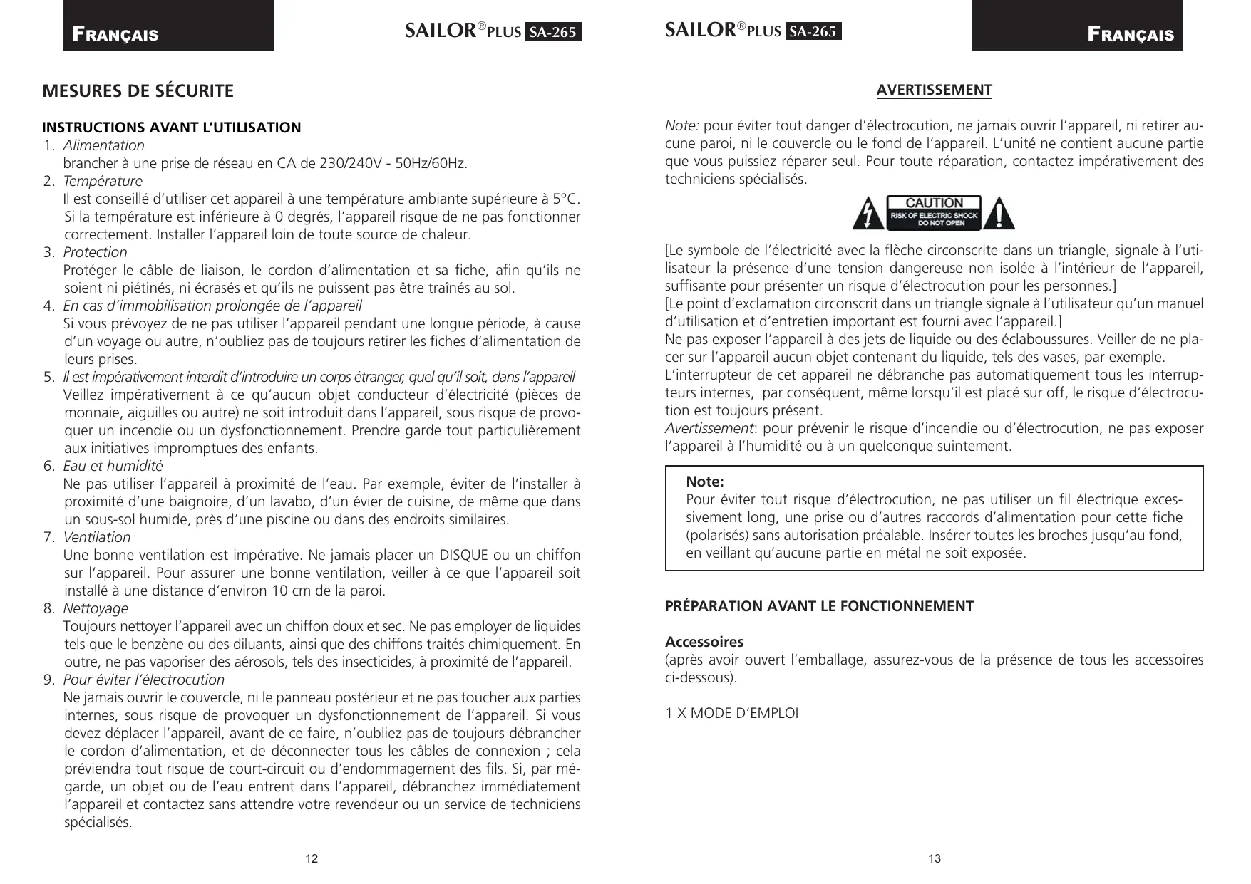 MODE D'EMPLOI PLUS SA-265 DABDAB+ HOME RADIO SAILOR