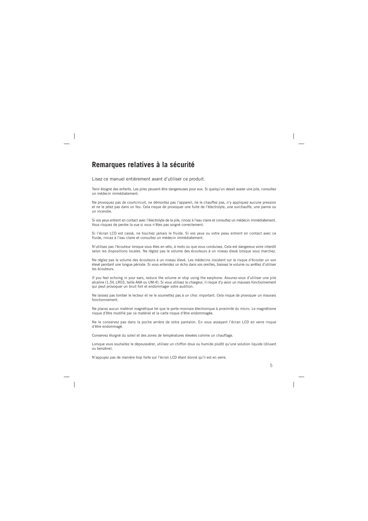 Remarques relatives à la sécurité Lisez ce manuel entièrement avant d’utiliser ce produit. Tenir éloigné des enfants. Les piles peuvent être dangereuses pour eux. Si quelqu’un devait avaler une pile, consultez un médecin immédiatement. Ne provoquez pas de courtcircuit, ne démontez pas l’appareil, ne le chauffez pas, n’y appliquez aucune pression et ne le jetez pas dans un feu. Cela risque de provoquer une fuite de l’électrolyte, une surchauffe, une panne ou un incendie. Si vos yeux entrent en contact avec l’électrolyte de la pile, rincez à l’eau claire et consultez un médecin immédiatement. Vous risquez de perdre la vue si vous n’êtes pas soigné correctement. Si l’écran LCD est cassé, ne touchez jamais le fluide. Si vos yeux ou votre peau entrent en contact avec ce fluide, rincez à l’eau claire et consultez un médecin immédiatement. N’utilisez pas l’écouteur lorsque vous êtes en vélo, à moto ou que vous conduisez. Cela est dangereux voire interdit selon les dispositions locales. Ne réglez pas le volume des écouteurs à un niveau élevé lorsque vous marchez. Ne réglez pas le volume des écouteurs à un niveau élevé. Les médecins insistent sur le risque d’écouter un son élevé pendant une longue période. Si vous entendez un écho dans vos oreilles, baissez le volume ou arrêtez d’utiliser les écouteurs. If you feel echoing in your ears, reduce the volume or stop using the earphone. Assurez-vous d’utiliser une pile alcaline (1,5V, LR03, taille AAA ou UM-4). Si vous utilisez le chargeur, il risque d’y avoir un mauvais fonctionnement qui peut provoquer un bruit fort et endommager votre audition. Ne laissez pas tomber le lecteur et ne le soumettez pas à un choc important. Cela risque de provoquer un mauvais fonctionnement. Ne placez aucun matériel magnétique tel que le porte-monnaie électronique à proximité du micro. Le magnétisme risque d’être modifié par ce matériel et la carte risque d’être endommagée. Ne le conservez pas dans la poche arrière de votre pantalon. En vous asseyant l’écran LCD en verre risque d’être endommagé. Conservez éloigné du soleil et des zones de températures élevées comme un chauffage. Lorsque vous souhaitez le dépoussiérer, utilisez un chiffon doux ou humide plutôt qu’une solution liquide (diluant ou benzène). N’appuyez pas de manière trop forte sur l’écran LCD étant donné qu’il est en verre.