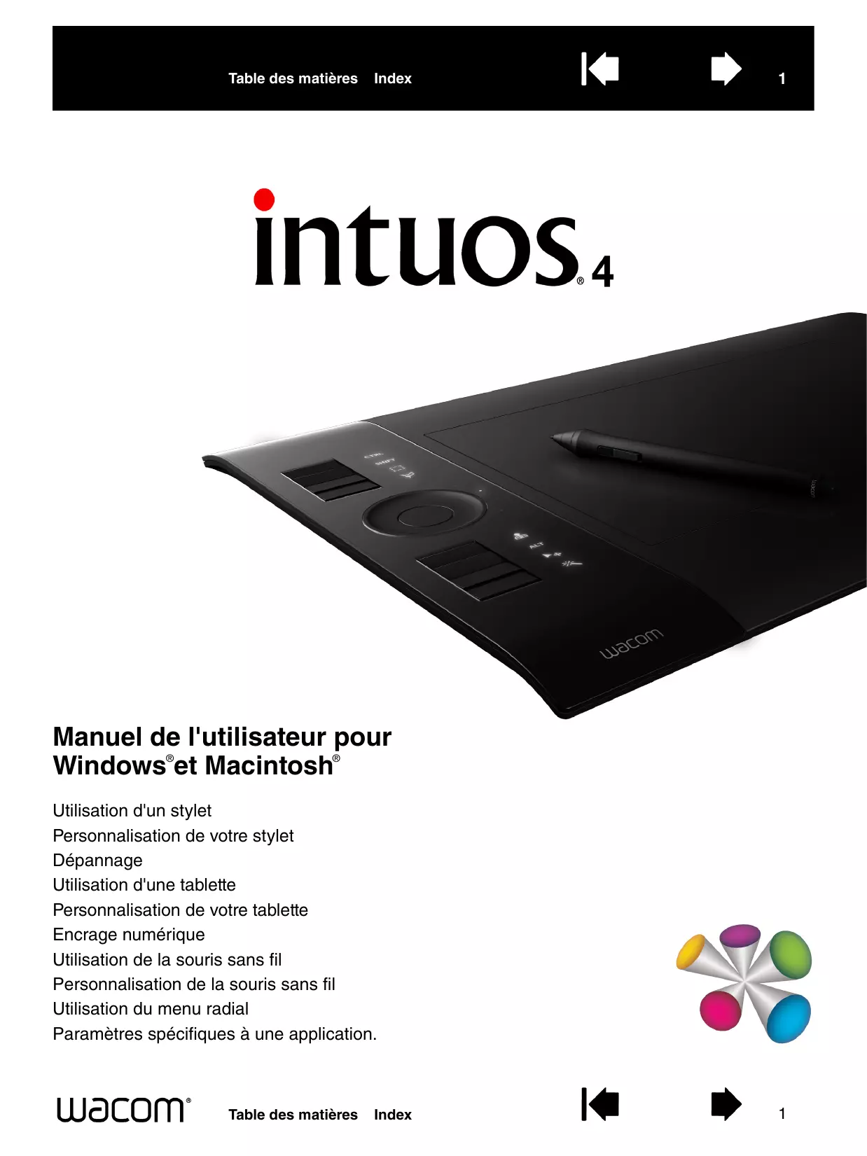 De nombreuses applications prennent en charge les fonctionnalités d'Intuos4 (telles que la sensibilité à la pression, l'inclinaison et la gomme du stylet). Pour savoir comment utiliser au mieux les fonctionnalités d'Intuos4 dans une application en particulier, consultez les manuels de ces applications. Reportez-vous également à la section informations sur le produit. Wacom a pour philosophie d'améliorer en permanence l'ensemble de ses produits. De ce fait, des modifications et des améliorations de la conception sont régulièrement apportées. Il est par conséquent possible que certaines modifications et améliorations ne soient pas abordées dans ce manuel. Table des matières Index