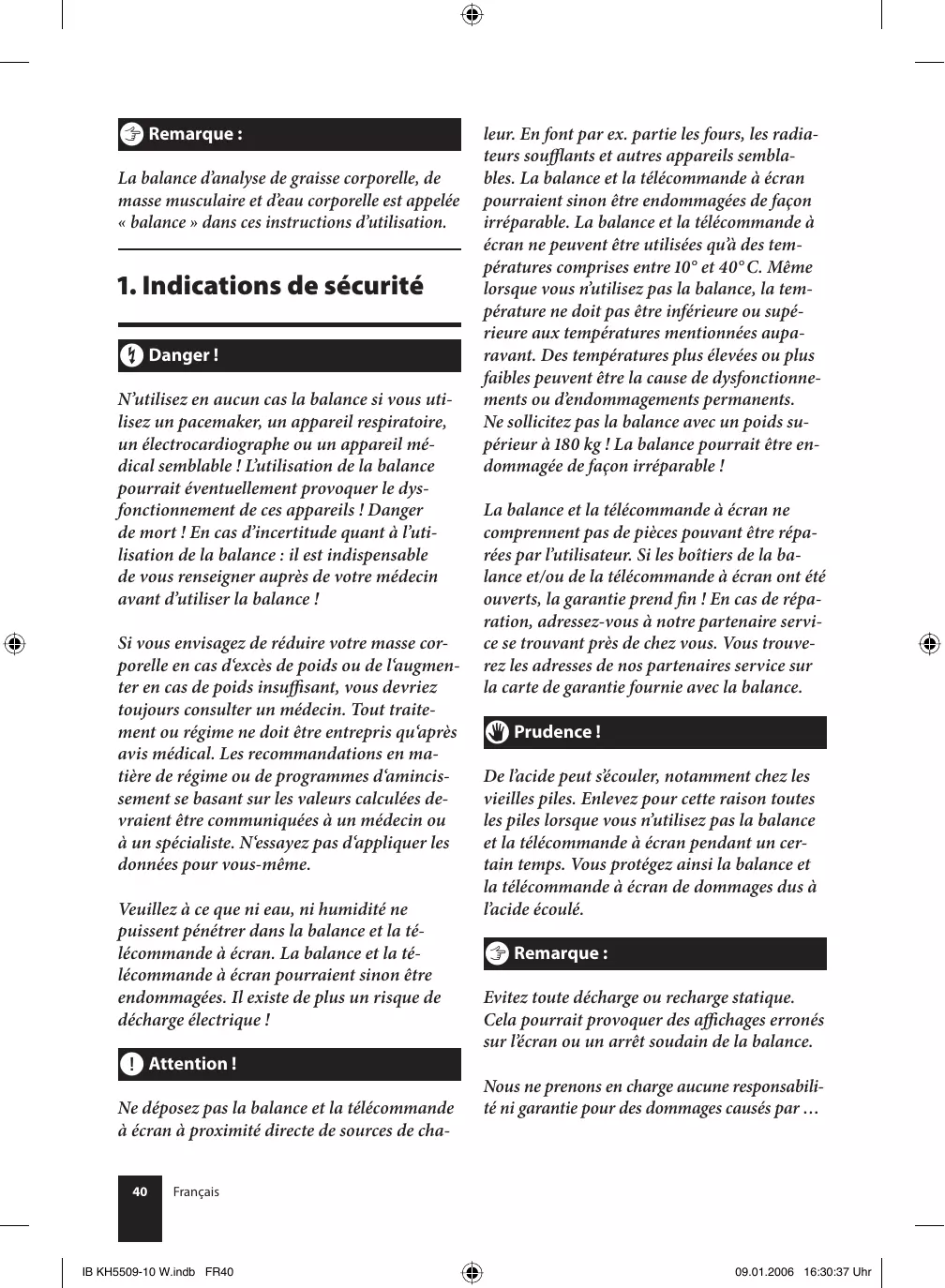 † Danger ! N’utilisez en aucun cas la balance si vous utilisez un pacemaker, un appareil respiratoire, un électrocardiographe ou un appareil médical semblable ! L’utilisation de la balance pourrait éventuellement provoquer le dysfonctionnement de ces appareils ! Danger de mort ! En cas d’incertitude quant à l’utilisation de la balance : il est indispensable de vous renseigner auprès de votre médecin avant d’utiliser la balance ! Si vous envisagez de réduire votre masse corporelle en cas d‘excès de poids ou de l‘augmenter en cas de poids insuffisant, vous devriez toujours consulter un médecin. Tout traitement ou régime ne doit être entrepris qu‘après avis médical. Les recommandations en matière de régime ou de programmes d‘amincissement se basant sur les valeurs calculées devraient être communiquées à un médecin ou à un spécialiste. N‘essayez pas d‘appliquer les données pour vous-même. Veuillez à ce que ni eau, ni humidité ne puissent pénétrer dans la balance et la télécommande à écran. La balance et la télécommande à écran pourraient sinon être endommagées. Il existe de plus un risque de décharge électrique ! | Attention ! Ne déposez pas la balance et la télécommande à écran à proximité directe de sources de cha40 leur. En font par ex. partie les fours, les radiateurs soufflants et autres appareils semblables. La balance et la télécommande à écran pourraient sinon être endommagées de façon irréparable. La balance et la télécommande à écran ne peuvent être utilisées qu’à des températures comprises entre ° et ° C. Même lorsque vous n’utilisez pas la balance, la température ne doit pas être inférieure ou supérieure aux températures mentionnées auparavant. Des températures plus élevées ou plus faibles peuvent être la cause de dysfonctionnements ou d’endommagements permanents. Ne sollicitez pas la balance avec un poids supérieur à kg ! La balance pourrait être endommagée de façon irréparable ! La balance et la télécommande à écran ne comprennent pas de pièces pouvant être réparées par l’utilisateur. Si les boîtiers de la balance et/ou de la télécommande à écran ont été ouverts, la garantie prend fin ! En cas de réparation, adressez-vous à notre partenaire service se trouvant près de chez vous. Vous trouverez les adresses de nos partenaires service sur la carte de garantie fournie avec la balance. ™ Prudence ! De l’acide peut s’écouler, notamment chez les vieilles piles. Enlevez pour cette raison toutes les piles lorsque vous n’utilisez pas la balance et la télécommande à écran pendant un certain temps. Vous protégez ainsi la balance et la télécommande à écran de dommages dus à l’acide écoulé. ô Remarque : Evitez toute décharge ou recharge statique. Cela pourrait provoquer des affichages erronés sur l’écran ou un arrêt soudain de la balance. Nous ne prenons en charge aucune responsabilité ni garantie pour des dommages causés par … Français IB KH5509-10 W.indb FR40