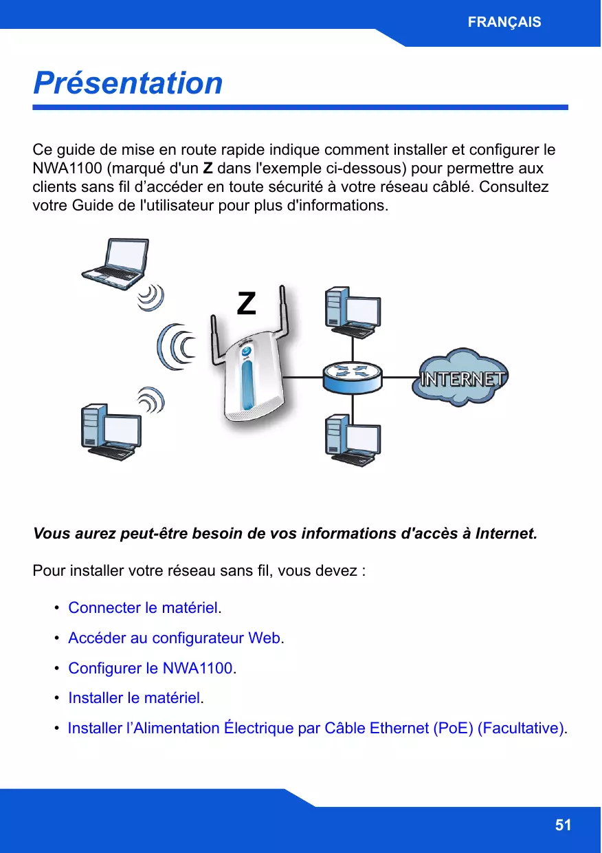 Présentation Ce guide de mise en route rapide indique comment installer et configurer le NWA1100 (marqué d'un Z dans l'exemple ci-dessous) pour permettre aux clients sans fil d’accéder en toute sécurité à votre réseau câblé. Consultez votre Guide de l'utilisateur pour plus d'informations.