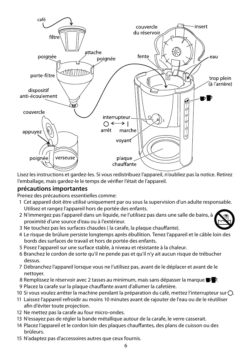 Prenez des précautions essentielles comme: 1 Cet appareil doit être utilisé uniquement par ou sous la supervision d’un adulte responsable. Utilisez et rangez l’appareil hors de portée des enfants. 2 N’immergez pas l’appareil dans un liquide, ne l’utilisez pas dans une salle de bains, à proximité d’une source d’eau ou à l’extérieur. 3 Ne touchez pas les surfaces chaudes ( la carafe, la plaque chauffante). 4 Le risque de brûlure persiste longtemps après ébullition. Tenez l’appareil et le câble loin des bords des surfaces de travail et hors de portée des enfants. 5 Posez l’appareil sur une surface stable, à niveau et résistante à la chaleur. 6 Branchez le cordon de sorte qu’il ne pende pas et qu’il n’y ait aucun risque de trébucher dessus. 7 Débranchez l’appareil lorsque vous ne l’utilisez pas, avant de le déplacer et avant de le nettoyer. 8 Remplissez le réservoir avec 2 tasses au minimum, mais sans dépasser la marque ;:. 9 Placez la carafe sur la plaque chauffante avant d’allumer la cafetière. 10 Si vous voulez arrêter la machine pendant la préparation du café, mettez l’interrupteur sur 0. 11 Laissez l’appareil refroidir au moins 10 minutes avant de rajouter de l’eau ou de le réutiliser afin d’éviter toute projection. 12 Ne mettez pas la carafe au four micro-ondes. 13 N’essayez pas de régler la bande métallique autour de la carafe, le verre casserait. 14 Placez l’appareil et le cordon loin des plaques chauffantes, des plans de cuisson ou des brûleurs. 15 N’adaptez pas d’accessoires autres que ceux fournis. 6