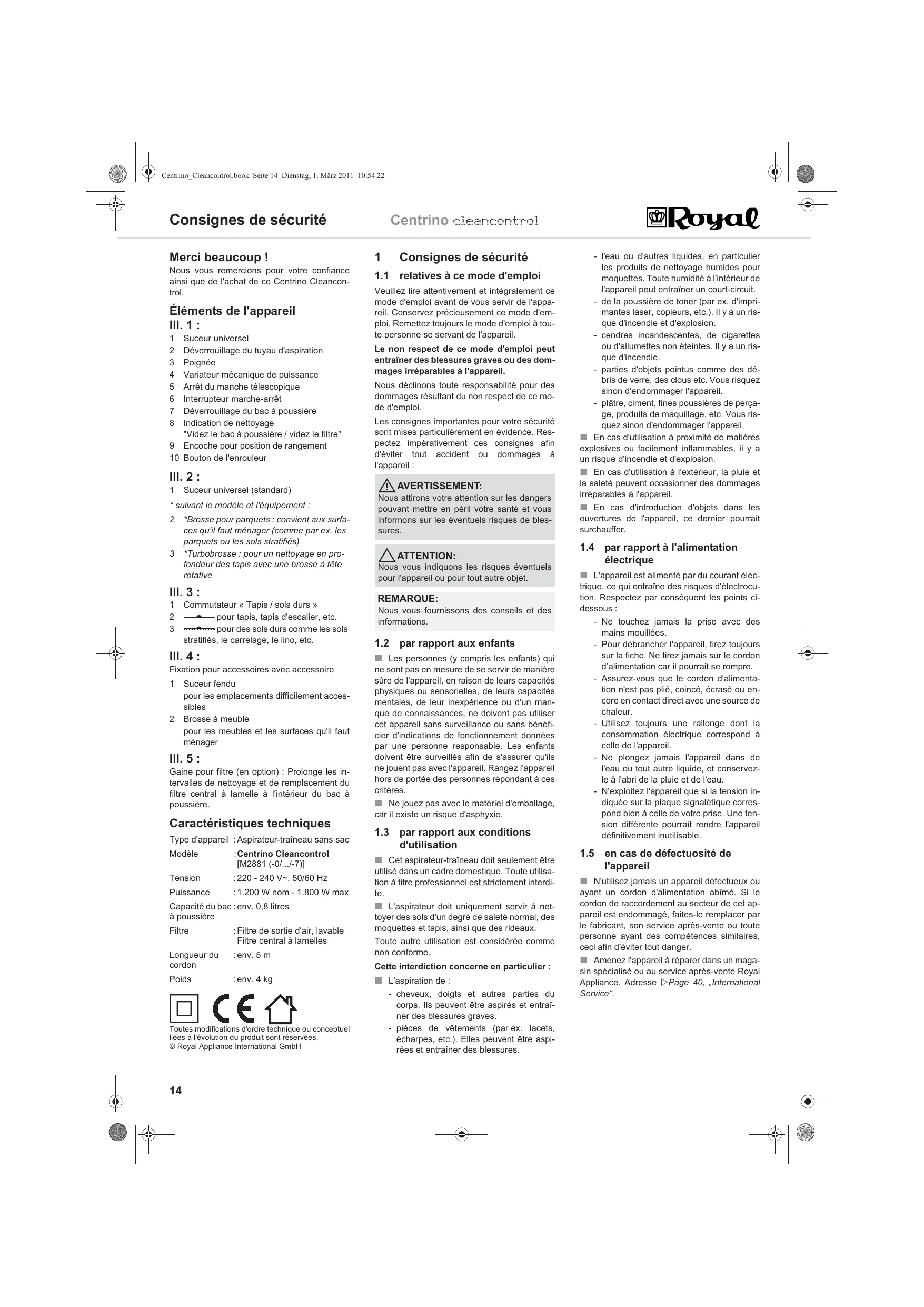 Faites remplacer le cordon par le service après-vente de Royal Appliance, adresse ZPage 40, „International Service“.