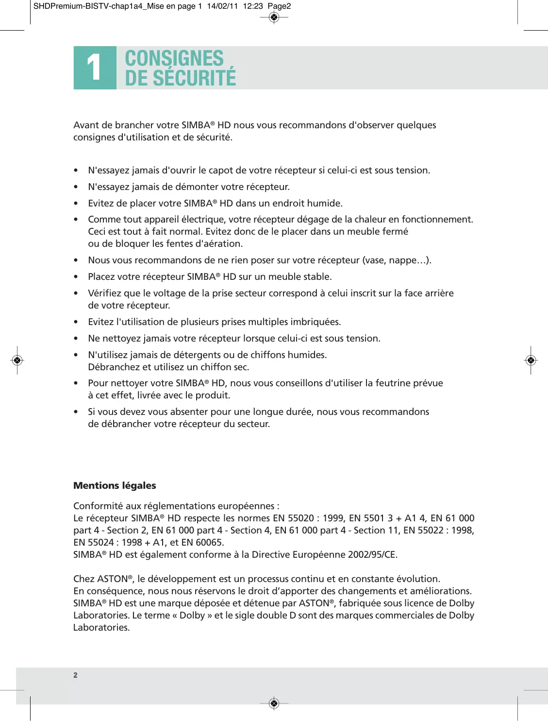 Si vous devez vous absenter pour une longue durée, nous vous recommandons de débrancher votre récepteur du secteur. Mentions légales Conformité aux réglementations européennes : Le récepteur SIMBA® HD respecte les normes EN 55020 : 1999, EN 5501 3 + A1 4, EN 61 000
