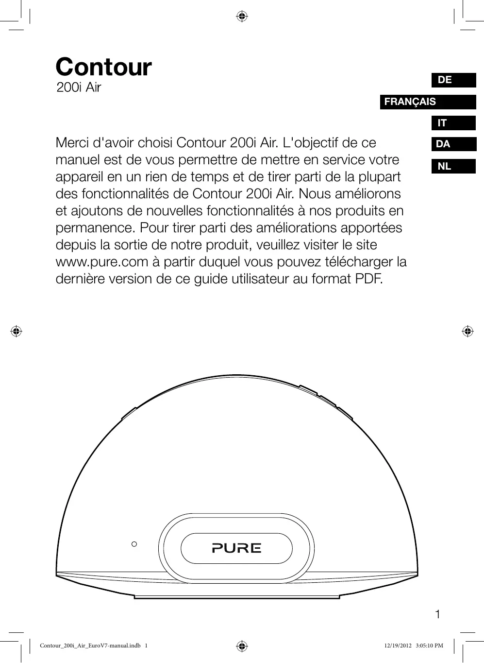 12/19/2012 3:05:09 PM DE ES FRANÇAIS ES IT Merci d'avoir choisi Contour 200i Air. L'objectif de ce manuel est de vous permettre de mettre en service votre appareil en un rien de temps et de tirer parti de la plupart des fonctionnalités de Contour 200i Air. Nous améliorons et ajoutons de nouvelles fonctionnalités à nos produits en permanence. Pour tirer parti des améliorations apportées depuis la sortie de notre produit, veuillez visiter le site www.pure.com à partir duquel vous pouvez télécharger la dernière version de ce guide utilisateur au format PDF.