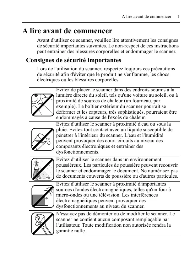 électriques ou les blessures corporelles. Evitez de placer le scanner dans des endroits soumis à la lumière directe du soleil, tels qu'une voiture au soleil, ou à proximité de sources de chaleur (un fourneau, par exemple). Le boîtier extérieur du scanner pourrait se déformer et les capteurs, très sophistiqués, pourraient être endommagés à cause de l'excès de chaleur. Evitez d'utiliser le scanner à proximité d'eau ou sous la pluie. Evitez tout contact avec un liquide susceptible de pénétrer à l'intérieur du scanner. L'eau et l'humidité peuvent provoquer des court-circuits au niveau des composants électroniques et entraîner des dysfonctionnements. Evitez d'utiliser le scanner dans un environnement poussiéreux. Les particules de poussière peuvent recouvrir le scanner et endommager le document. Ne numérisez pas de documents couverts de poussière ou d'autres particules. Evitez d'utiliser le scanner à proximité d'importantes sources d'ondes électromagnétiques, telles qu'un four à micro-ondes ou une télévision. Les interférences électromagnétiques peuvent provoquer des dysfonctionnements au niveau du scanner. N'essayez pas de démonter ou de modifier le scanner. Le scanner ne contient aucun composant remplaçable par l'utilisateur. Toute modification non autorisée rendra la garantie nulle.