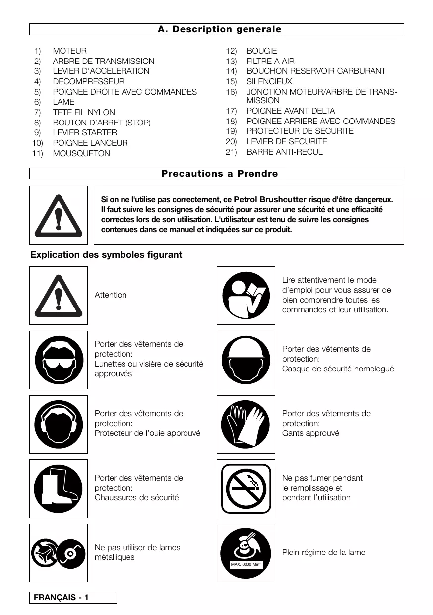 BARRE ANTI-RECUL Precautions a Prendre Si on ne l'utilise pas correctement, ce Petrol Brushcutter risque d'être dangereux. Il faut suivre les consignes de sécurité pour assurer une sécurité et une efficacité correctes lors de son utilisation. L'utilisateur est tenu de suivre les consignes contenues dans ce manuel et indiquées sur ce produit. Explication des symboles figurant Attention Lire attentivement le mode d’emploi pour vous assurer de bien comprendre toutes les commandes et leur utilisation. Porter des vêtements de protection: Lunettes ou visière de sécurité approuvés Porter des vêtements de protection: Casque de sécurité homologué Porter des vêtements de protection: Protecteur de l’ouie approuvé Porter des vêtements de protection: Gants approuvé Porter des vêtements de protection: Chaussures de sécurité Ne pas fumer pendant le remplissage et pendant l’utilisation Ne pas utiliser de lames métalliques Plein régime de la lame MAX. 0000 Min-1