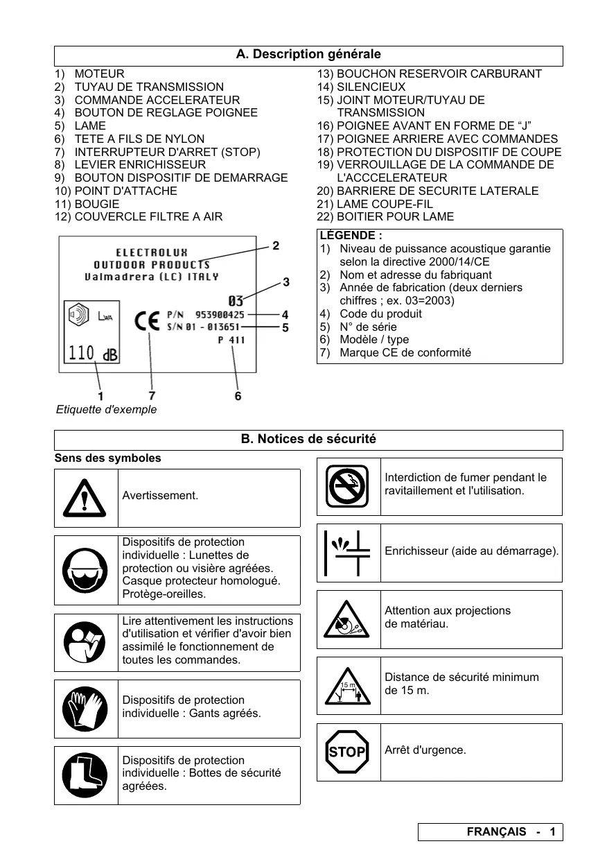 Etiquette d'exemple B. Notices de sécurité Sens des symboles Interdiction de fumer pendant le ravitaillement et l'utilisation. Avertissement. Dispositifs de protection individuelle : Lunettes de protection ou visière agréées. Casque protecteur homologué. Protège-oreilles. Enrichisseur (aide au démarrage). Attention aux projections de matériau. Lire attentivement les instructions d'utilisation et vérifier d'avoir bien assimilé le fonctionnement de toutes les commandes. 15 m Dispositifs de protection individuelle : Gants agréés. Dispositifs de protection individuelle : Bottes de sécurité agréées. Distance de sécurité minimum de 15 m. Arrêt d'urgence.