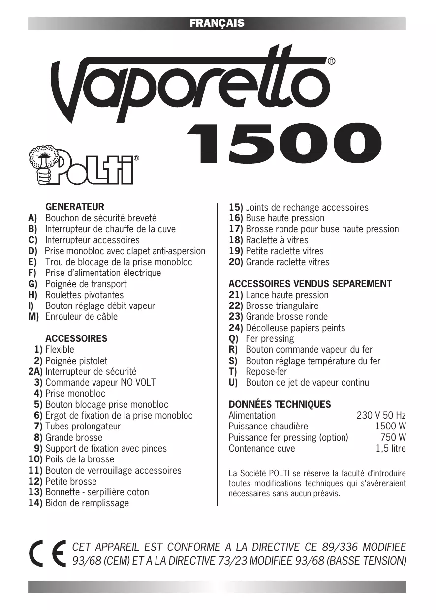 Retrouvez gratuitement la notice de l'appareil 1500 VAPORETTO au format PDF.
