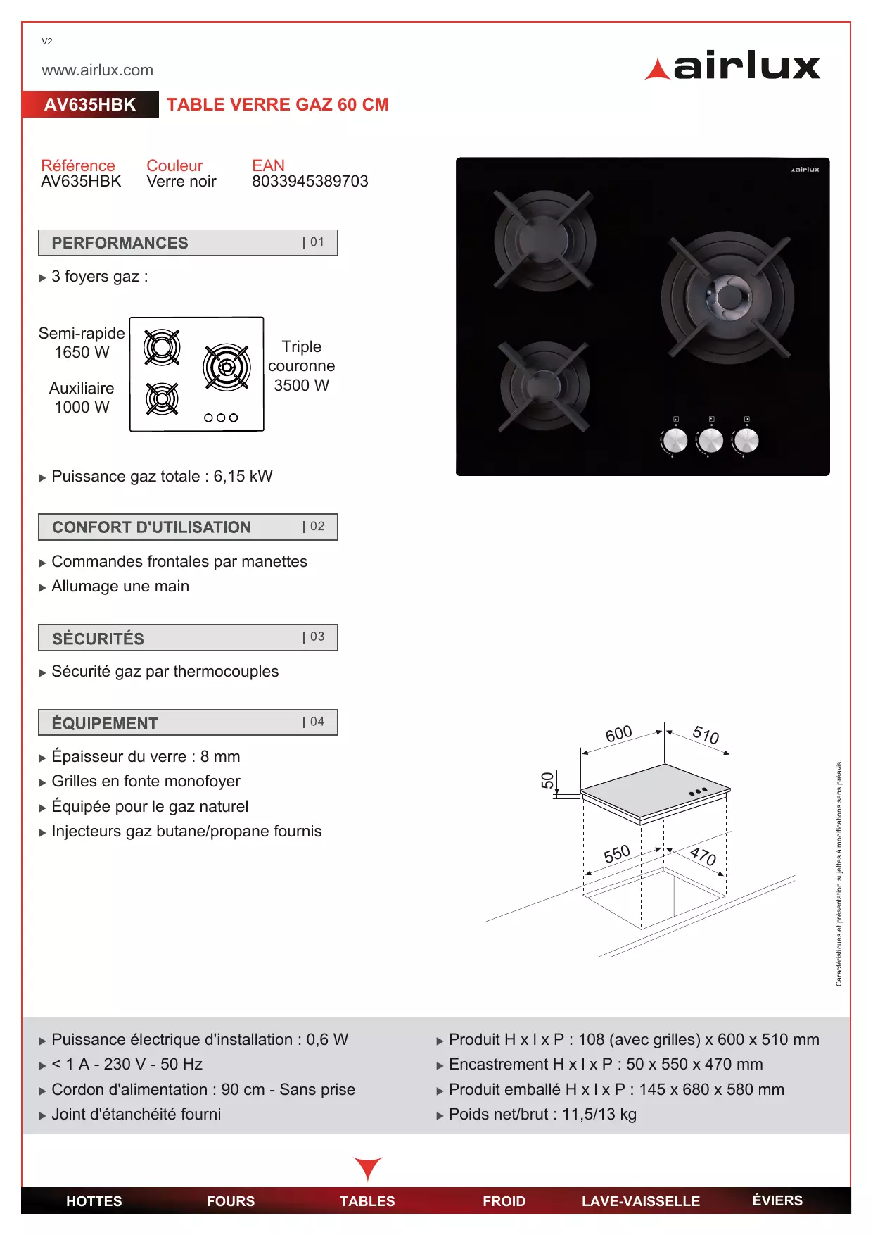 AV 635 HWH - Table de cuisson gaz AIRLUX - Notice d'utilisation et mode d'emploi gratuit