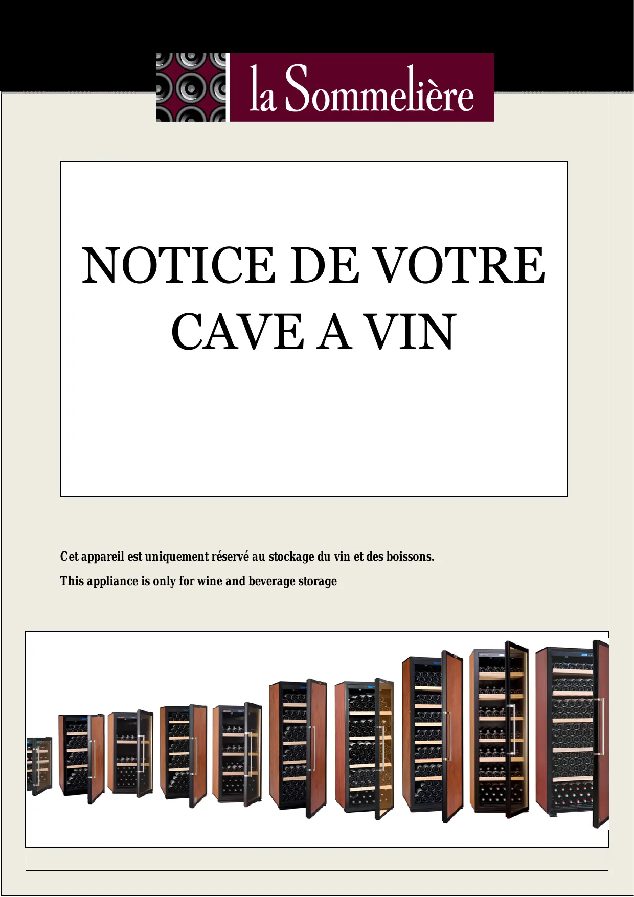 NOTICE DE VOTRE CAVE A VIN Cet appareil est uniquement réservé au stockage du vin et des boissons. This appliance is only for wine and beverage storage