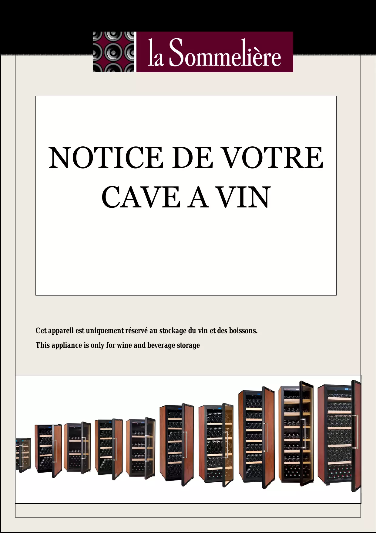 NOTICE DE VOTRE CAVE A VIN Cet appareil est uniquement réservé au stockage du vin et des boissons. This appliance is only for wine and beverage storage
