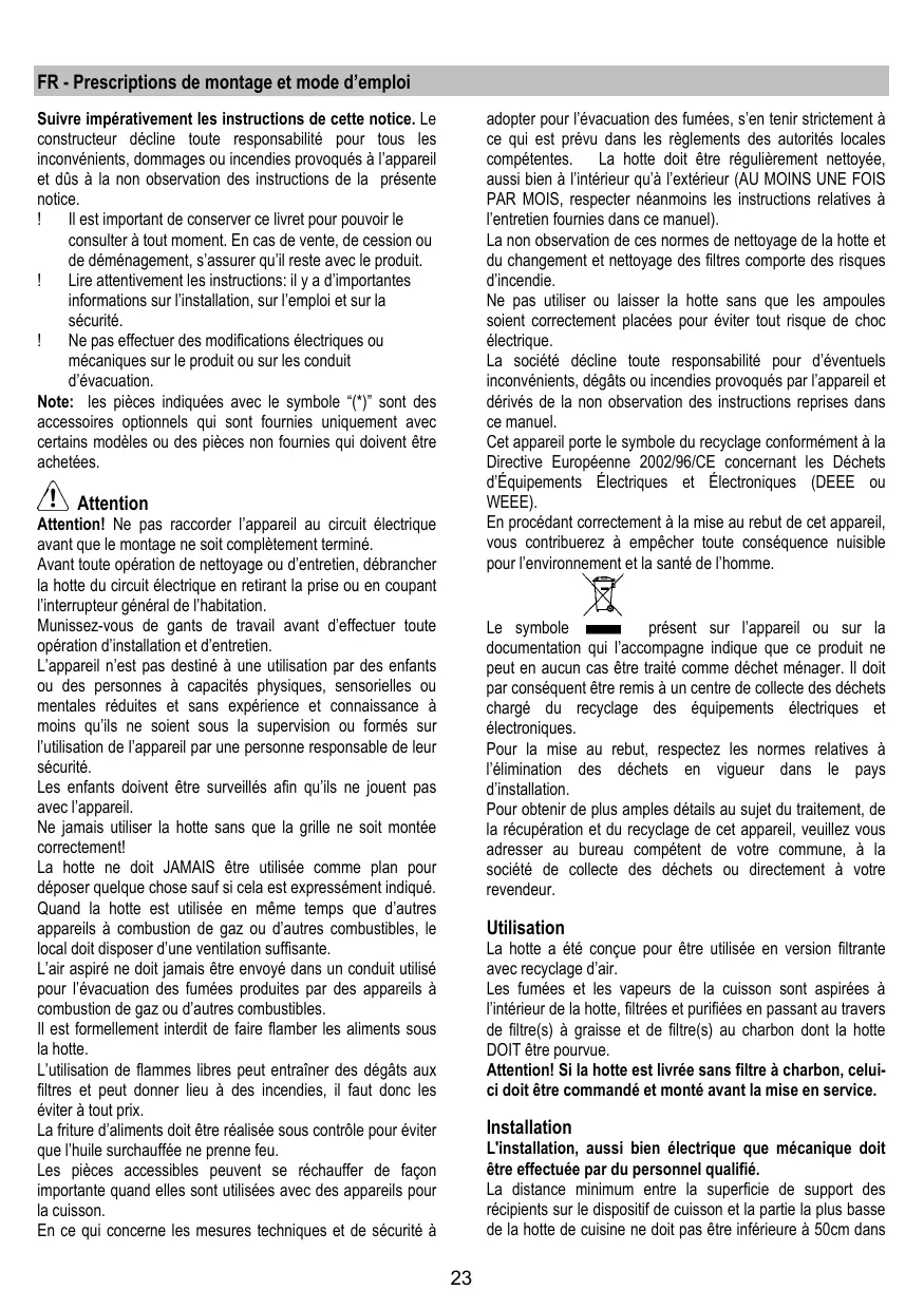 adopt pour l'évacuation des fumées, s'en tenir strictement à ce qui est prévu dans les règlements des autorités locales compétentes. La hotte doit être régulièrement nettoyée, aussi bien à l'intérieur qu'à l'extérieur (AU MOINS UNE FOIS PAR MOIS, respecter néanmoins les instructions relatives à l'entretien fournies dans ce manuel).