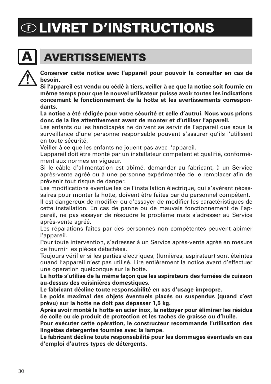 AVERTISSEMENTS Conserver cette notice avec l’appareil pour pouvoir la consulter en cas de besoin. Si l’appareil est vendu ou cédé à tiers, veiller à ce que la notice soit fournie en même temps pour que le nouvel utilisateur puisse avoir toutes les indications concernant le fonctionnement de la hotte et les avertissements correspondants. La notice a été rédigée pour votre sécurité et celle d’autrui. Nous vous prions donc de la lire attentivement avant de monter et d’utiliser l’appareil. Les enfants ou les handicapés ne doivent se servir de l’appareil que sous la surveillance d’une personne responsable pouvant s’assurer qu’ils l’utilisent en toute sécurité. Veiller à ce que les enfants ne jouent pas avec l’appareil. L’appareil doit être monté par un installateur compétent et qualifié, conformément aux normes en vigueur. Si le câble d’alimentation est abîmé, demander au fabricant, à un Service après-vente agréé ou à une personne expérimentée de le remplacer afin de prévenir tout risque de danger. Les modifications éventuelles de l’installation électrique, qui s’avèrent nécessaires pour monter la hotte, doivent être faites par du personnel compétent. Il est dangereux de modifier ou d’essayer de modifier les caractéristiques de cette installation. En cas de panne ou de mauvais fonctionnement de l’appareil, ne pas essayer de résoudre le problème mais s’adresser au Service après-vente agréé. Les réparations faites par des personnes non compétentes peuvent abîmer l’appareil. Pour toute intervention, s’adresser à un Service après-vente agréé en mesure de fournir les pièces détachées. Toujours vérifier si les parties électriques, (lumières, aspirateur) sont éteintes quand l’appareil n’est pas utilisé. Lire entièrement la notice avant d’effectuer une opération quelconque sur la hotte. La hotte s’utilise de la même façon que les aspirateurs des fumées de cuisson au-dessus des cuisinières domestiques. Le fabricant décline toute responsabilité en cas d’usage impropre. Le poids maximal des objets éventuels placés ou suspendus (quand c’est prévu) sur la hotte ne doit pas dépasser 1,5 kg. Après avoir monté la hotte en acier inox, la nettoyer pour éliminer les résidus de colle ou de produit de protection et les taches de graisse ou d’huile. Pour exécuter cette opération, le constructeur recommande l’utilisation des lingettes détergentes fournies avec la lampe. Le fabricant décline toute responsabilité pour les dommages éventuels en cas d’emploi d’autres types de détergents.