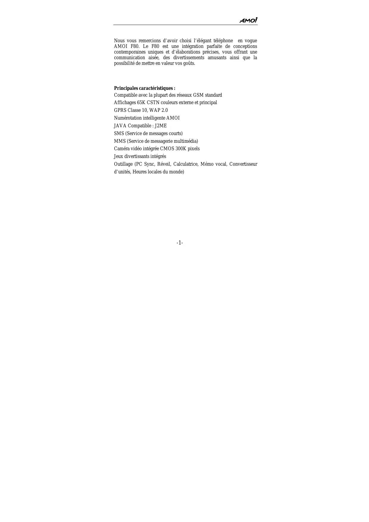 Nous vous remercions d’avoir choisi l’élégant téléphone en vogue AMOI F80. Le F80 est une intégration parfaite de conceptions contemporaines uniques et d’élaborations précises, vous offrant une communication aisée, des divertissements amusants ainsi que la possibilité de mettre en valeur vos goûts. Principales caractéristiques : Compatible avec la plupart des réseaux GSM standard Affichages 65K CSTN couleurs externe et principal GPRS Classe 10, WAP 2.0 Numérotation intelligente AMOI JAVA Compatible : J2ME SMS (Service de messages courts) MMS (Service de messagerie multimédia) Caméra vidéo intégrée CMOS 300K pixels Jeux divertissants intégrés Outillage (PC Sync, Réveil, Calculatrice, Mémo vocal, Convertisseur d’unités, Heures locales du monde)