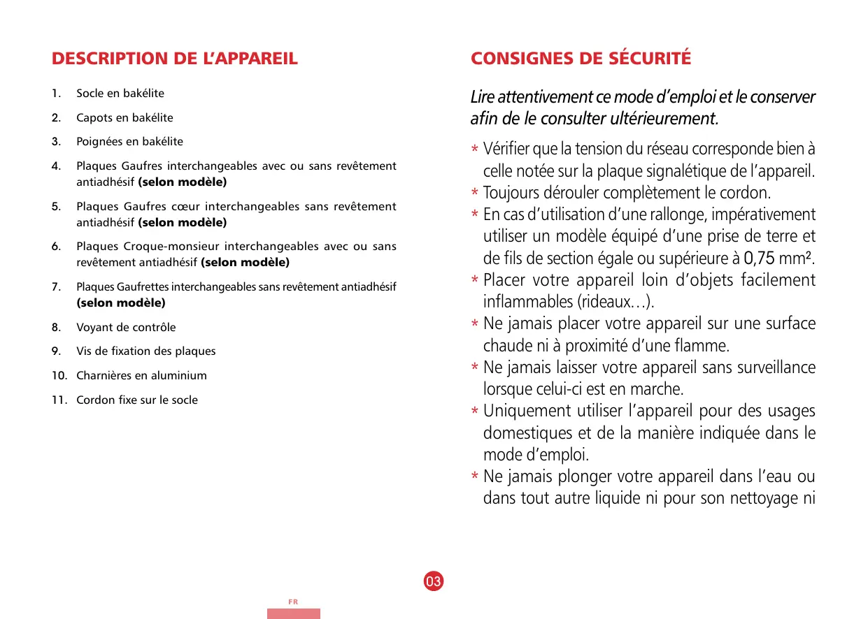CARACTÉRISTIQUES CORDON **Thermostat de sécurité et voyant de contrôle **Gaufrier réversible sur son socle **Multifonction avec des plaques interchangeables vendues séparément chez **Vis sur chaque côté pour fixer les plaques **Plaques massives en fonte d’aluminium avec ou sans revêtement antiadhésif sur les plaques (selon modèle) **Capots, poignées et socle en bakélite **230 Volts - 50 Hz - 1 000 Watts Il faut examiner attentivement le câble d’alimentation avant toute utilisation. Si celui-ci est endommagé, il ne faut pas utiliser l’appareil. Le cordon ne doit être remplacé que par , son service après-vente ou une personne qualifiée et agréée par et ce afin d’éviter un danger pour l’usager. Le cordon utilisé est un HO5VV-F 3 G 0,75 mm². Ces appareils sont conformes aux directives 2006/95/CE, 2004/108/ CE, DEEE 2002/96/CE, RoHs 2002/95/CE et au règlement CE contact alimentaire 1935/2004. JEUX DE PLAQUES VENDUS SÉPARÉMENT : **Plaques de 2 gaufres 155 x 100 mm sans revêtement antiadhésif (REF 030 121) **Plaques de 2 gaufres 155 x 100 mm avec revêtement antiadhésif (REF 030 122) **Plaques de 4 gaufrettes 100 x 77 mm sans revêtement antiadhésif (REF 030 221) **Plaques de 4 croque-monsieur de 120 x 95 mm sans revêtement antiadhésif (REF 030 421) **Plaques de 4 croque-monsieur de 120 x 95 mm avec revêtement antiadhésif (REF 030 422) **Plaques de 6 gaufres cœur sans revêtement antiadhésif (REF 030 521)