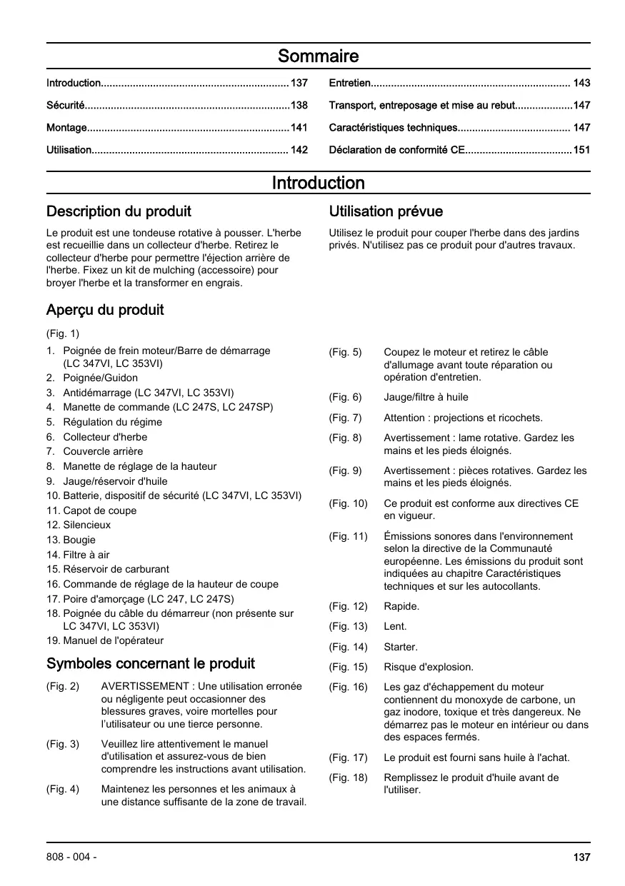 (Fig. 1) 1. Poignée de frein moteur/Barre de démarrage (LC 347VI, LC 353VI) 2. Poignée/Guidon 3. Antidémarrage (LC 347VI, LC 353VI) 4. Manette de commande (LC 247S, LC 247SP) 5. Régulation du régime 6. Collecteur d'herbe 7. Couvercle arrière 8. Manette de réglage de la hauteur 9. Jauge/réservoir d'huile 10. Batterie, dispositif de sécurité (LC 347VI, LC 353VI) 11. Capot de coupe 12. Silencieux 13. Bougie 14. Filtre à air 15. Réservoir de carburant 16. Commande de réglage de la hauteur de coupe 17. Poire d'amorçage (LC 247, LC 247S) 18. Poignée du câble du démarreur (non présente sur LC 347VI, LC 353VI) 19. Manuel de l'opérateur