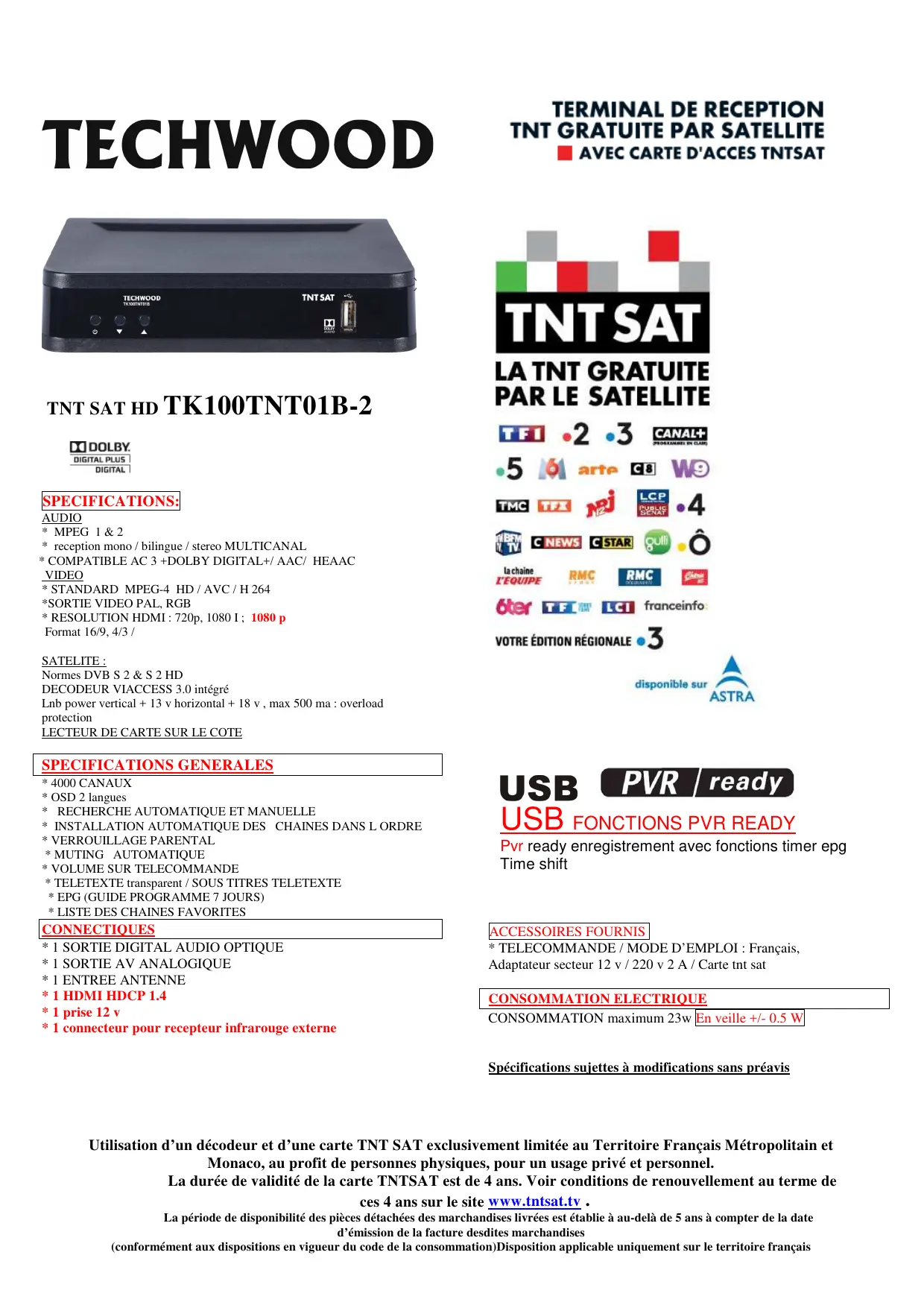 TK100TNT01B - Décodeur satellite TECHWOOD - Notice d'utilisation et mode d'emploi gratuit