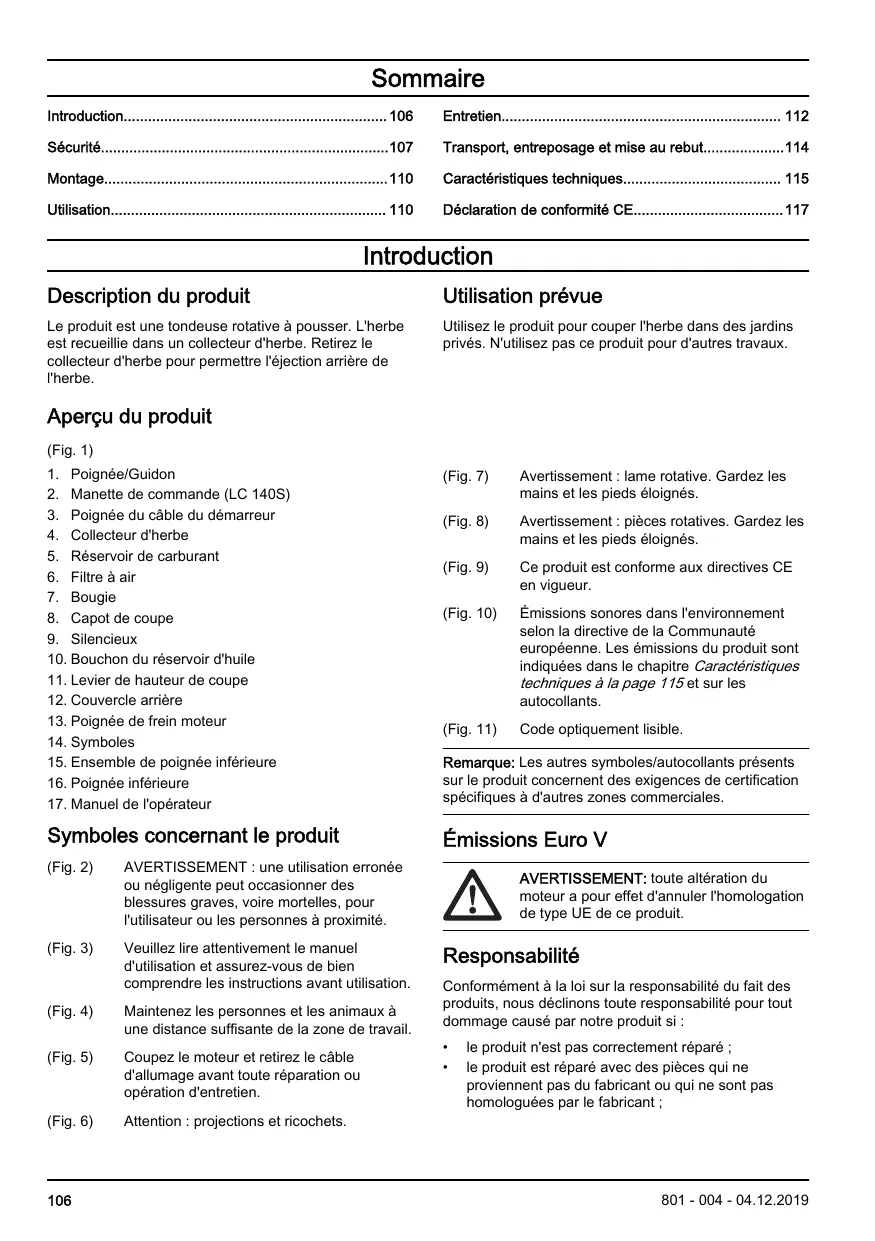 (Fig. 1) 1. Poignée/Guidon 2. Manette de commande (LC 140S) 3. Poignée du câble du démarreur 4. Collecteur d'herbe 5. Réservoir de carburant 6. Filtre à air 7. Bougie 8. Capot de coupe 9. Silencieux 10. Bouchon du réservoir d'huile 11. Levier de hauteur de coupe 12. Couvercle arrière 13. Poignée de frein moteur 14. Symboles 15. Ensemble de poignée inférieure 16. Poignée inférieure 17. Manuel de l'opérateur