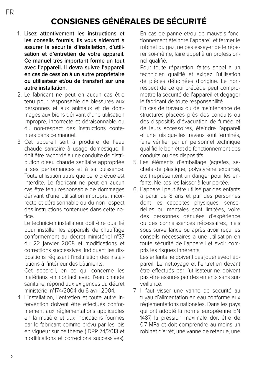 Cet apparéil, en ce qui concerne les matériaux en contact avec l'eau chaude sanitaire, répond aux exigences du décret ministeriel n°174/2004 du 6 avril 2004.