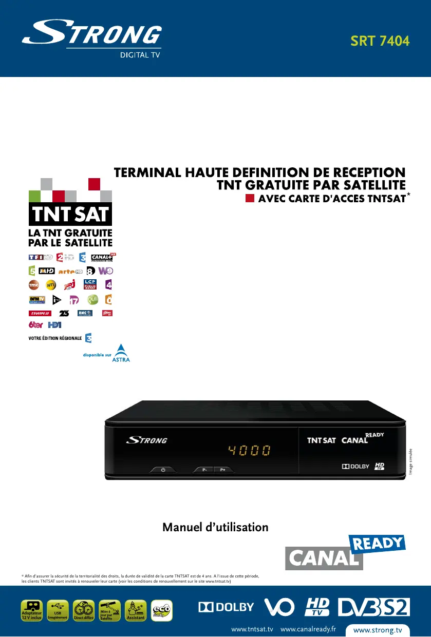 Les droits d’accès de la carte TNTSAT s’activent automatiquement à la première insertion de la carte dans le terminal, pour une durée de 48 mois. Il est recommandé de réaliser cette activation avant la date limite d’initialisation de la carte. La carte d’accès TNTSAT, tout comme le terminal STRONG SRT 7404, sont garantis 24 mois à partir de la date d’achat chez votre distributeur, en application de nos consignes de sécurité notifiées en page 2 du manuel. Si vous rencontrez des difficultés lors de l’installation ou lors de la mise en service de votre terminal, veuillez contacter: SFS au: 0826 029 928 (coût de l’appel: 0,15€ par minute) Une assistance répondra à vos questions. Si l’assistance téléphonique détermine la défectuosité du produit, SFS vous communiquera la procédure à suivre. SFS 150 rue de la Pierre D’Angeroux 74800 la Roche sur Foron France La durée de validité de la carte TNTSAT est de 4 ans. Voir conditions de renouvellement au terme de ces 4 ans sur le site www.tntsat.tv Utilisation d’un décodeur et d’une carte TNTSAT exclusivement limitée au Territoire Français Métropolitain et Monaco, au profit de personnes physiques, pour un usage privé et personnel.