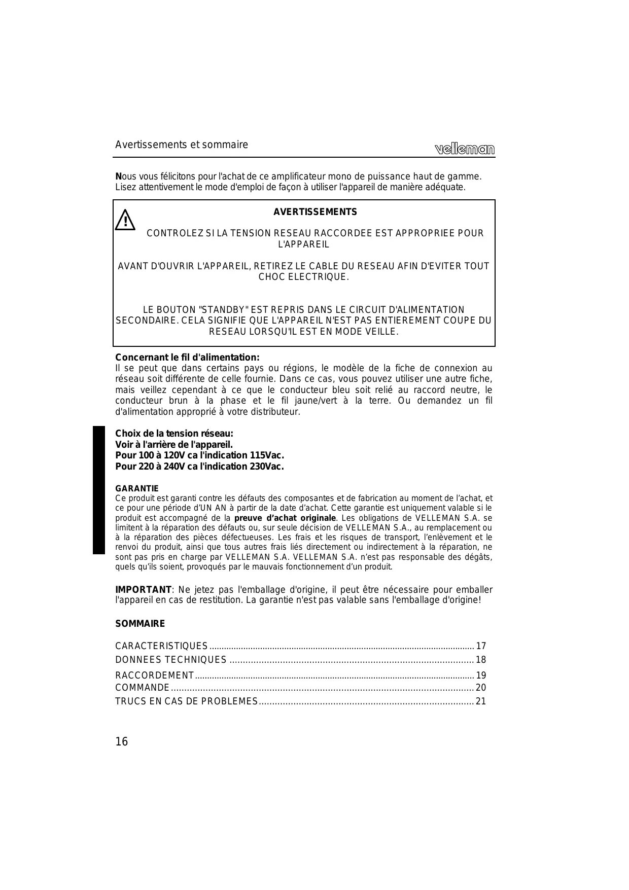 Ce produit est garanti contre les défauts des composants et de fabrication au moment de l'achat, et ce pour une période d'UN AN à partir de la date d'achat. Cette garantie est uniquement valable si le produit est accompagné de la preuve d'achat originale. Les obligations de VELLEMAN S. A. se limitent à la réparation des défauts ou, sur seule décision de VELLEMAN S. A., au remplacement ou à la réparation des pièces défectueuses. Les frais et les risques de transport, l'enlèvement et le renvoi du produit, ainsi que tous autres frais liés directement ou indirectement à la réparation, ne sont pas pris en charge par VELLEMAN S. A. VELLEMAN S. A. n'est pas responsable des dégâts, quels qu'ils soient, provoqués par le mauvais fonctionnement d'un produit.