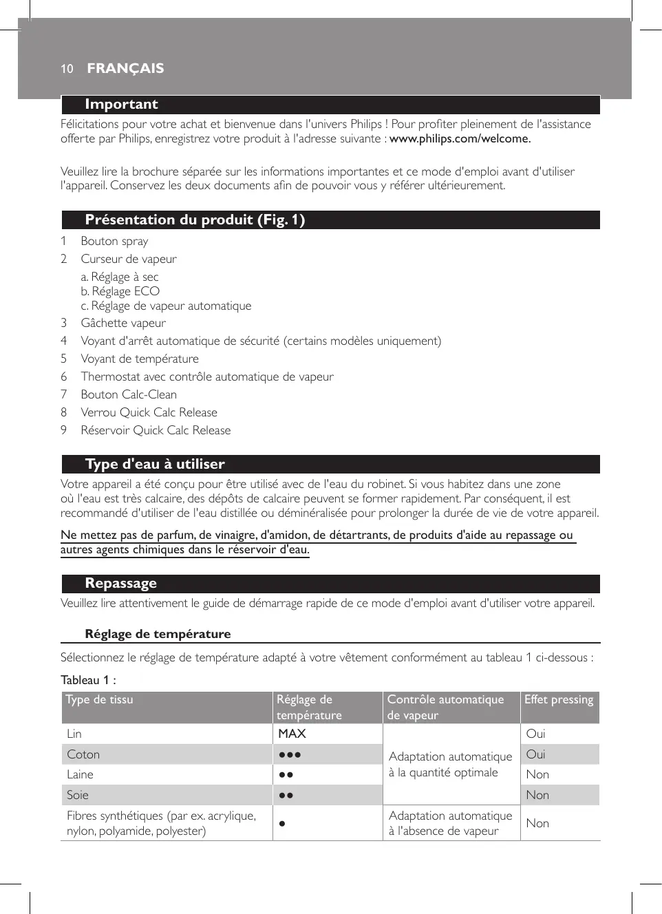Veuillez lire attentivement le guide de démarrage rapide de ce mode d'emploi avant d'utiliser votre appareil. Réglage de température Sélectionnez le réglage de température adapté à votre vêtement conformément au tableau 1 ci-dessous : Tableau 1 : Type de tissu