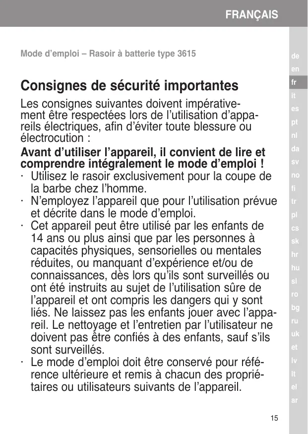 Mode d’emploi – Rasoir à batterie type 3615 15