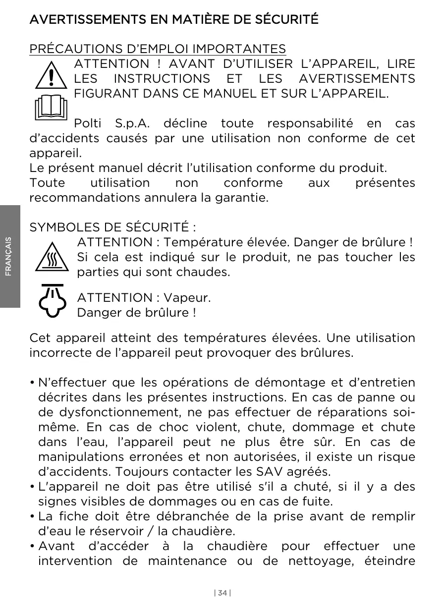 FIGURANT DANS CE MANUEL ET SUR L’APPAREIL. FRANÇAIS Polti S.p.A. décline toute responsabilité en cas d’accidents causés par une utilisation non conforme de cet appareil. Le présent manuel décrit l’utilisation conforme du produit. Toute utilisation non conforme aux présentes recommandations annulera la garantie. SYMBOLES DE SÉCURITÉ : ATTENTION : Température élevée. Danger de brûlure ! Si cela est indiqué sur le produit, ne pas toucher les parties qui sont chaudes. ATTENTION : Vapeur. Danger de brûlure ! Cet appareil atteint des températures élevées. Une utilisation incorrecte de l’appareil peut provoquer des brûlures.