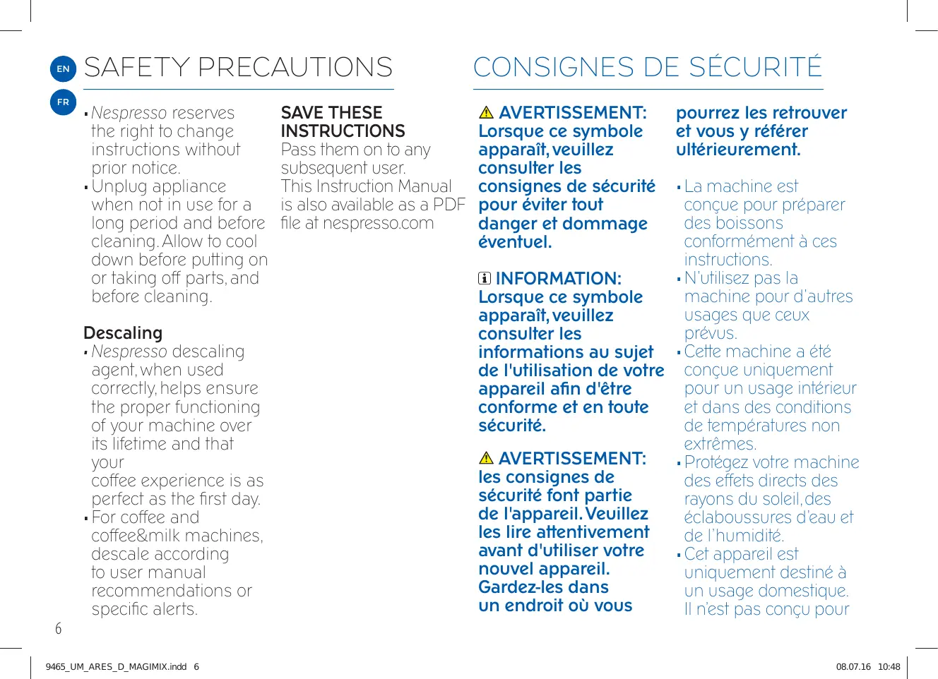 - For coffee and coffee&milk machines, descale according to user manual recommendations or specific alerts. 9465_UM_ARES_D_MAGIMIX.indd 6 SAVE THESE INSTRUCTIONS Pass them on to any subsequent user. This Instruction Manual is also available as a PDF file at nespresso.com pourrez les retrouver et vous y référer ultérieurement.