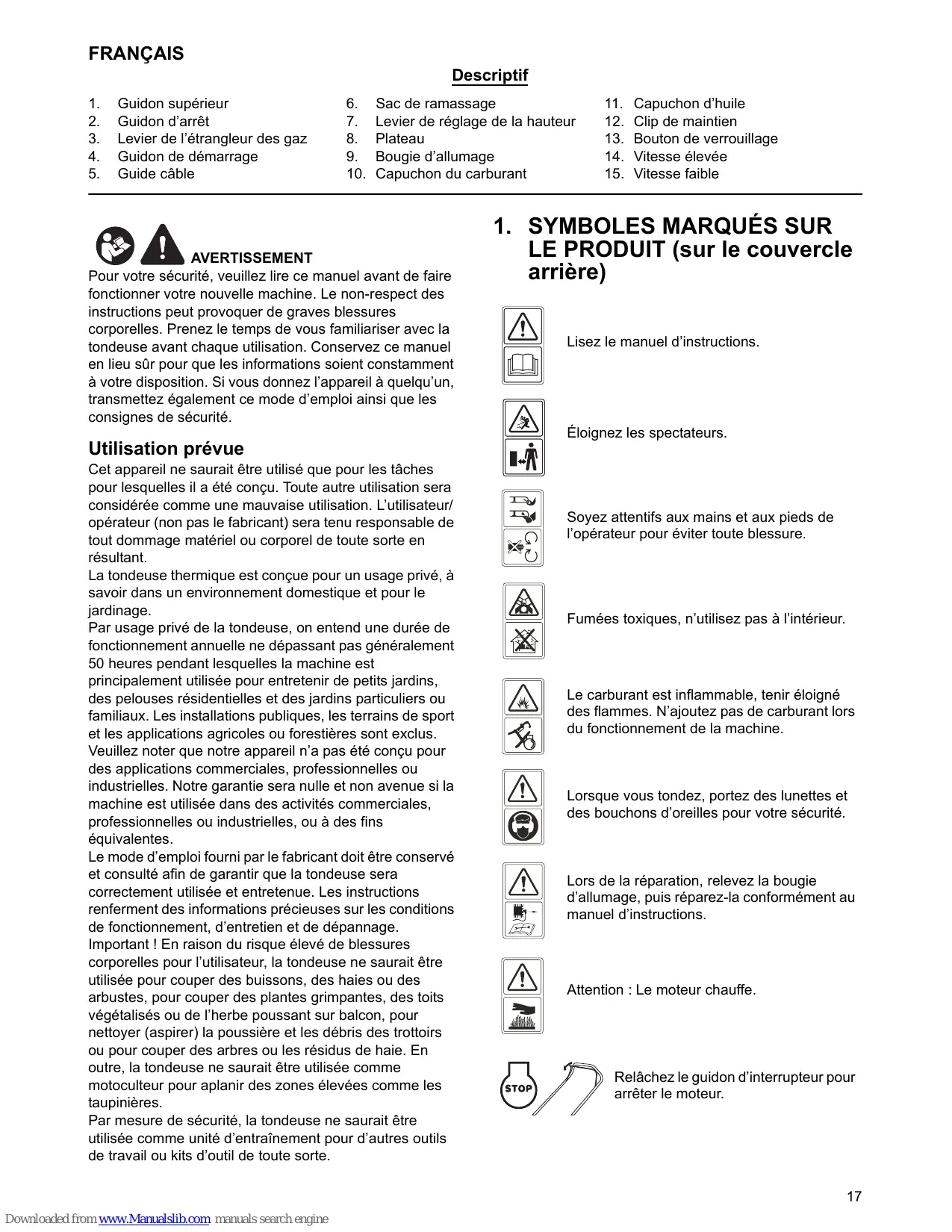 AVERTISSEMENT Pour votre sécurité, veuillez lire ce manuel avant de faire fonctionner votre nouvelle machine. Le non-respect des instructions peut provoquer de graves blessures corporelles. Prenez le temps de vous familiariser avec la tondeuse avant chaque utilisation. Conservez ce manuel en lieu sûr pour que les informations soient constamment