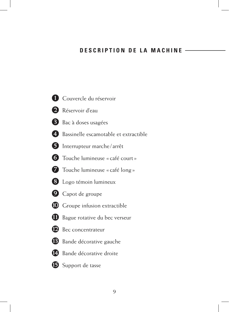 D E S C R I P T I O N de la M A C H I N E • Couvercle du réservoir Réservoir d’eau Bac à doses usagées Bassinelle escamotable et extractible Interrupteur marche / arrêt Touche lumineuse « café court » Touche lumineuse « café long » Logo témoin lumineux Capot de groupe Groupe infusion extractible Bague rotative du bec verseur Bec concentrateur Bande décorative gauche Bande décorative droite Support de tasse