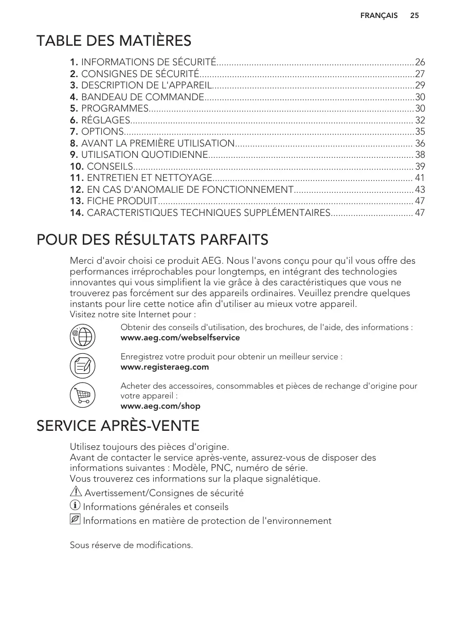 Merci d'avoir choisi ce produit AEG. Nous l'avons conçu pour qu'il vous offre des performances irréprochables pour longtemps, en intégrant des technologies innovantes qui vous simplifient la vie grâce à des caractéristiques que vous ne trouverez pas forcément sur des appareils ordinaires. Veuillez prendre quelques instants pour lire cette notice afin d'utiliser au mieux votre appareil. Visitez notre site Internet pour : Obtenir des conseils d'utilisation, des brochures, de l'aide, des informations : www.aeg.com/webselfservice Enregistrez votre produit pour obtenir un meilleur service : www.registeraeg.com Acheter des accessoires, consommables et pièces de rechange d'origine pour votre appareil : www.aeg.com/shop