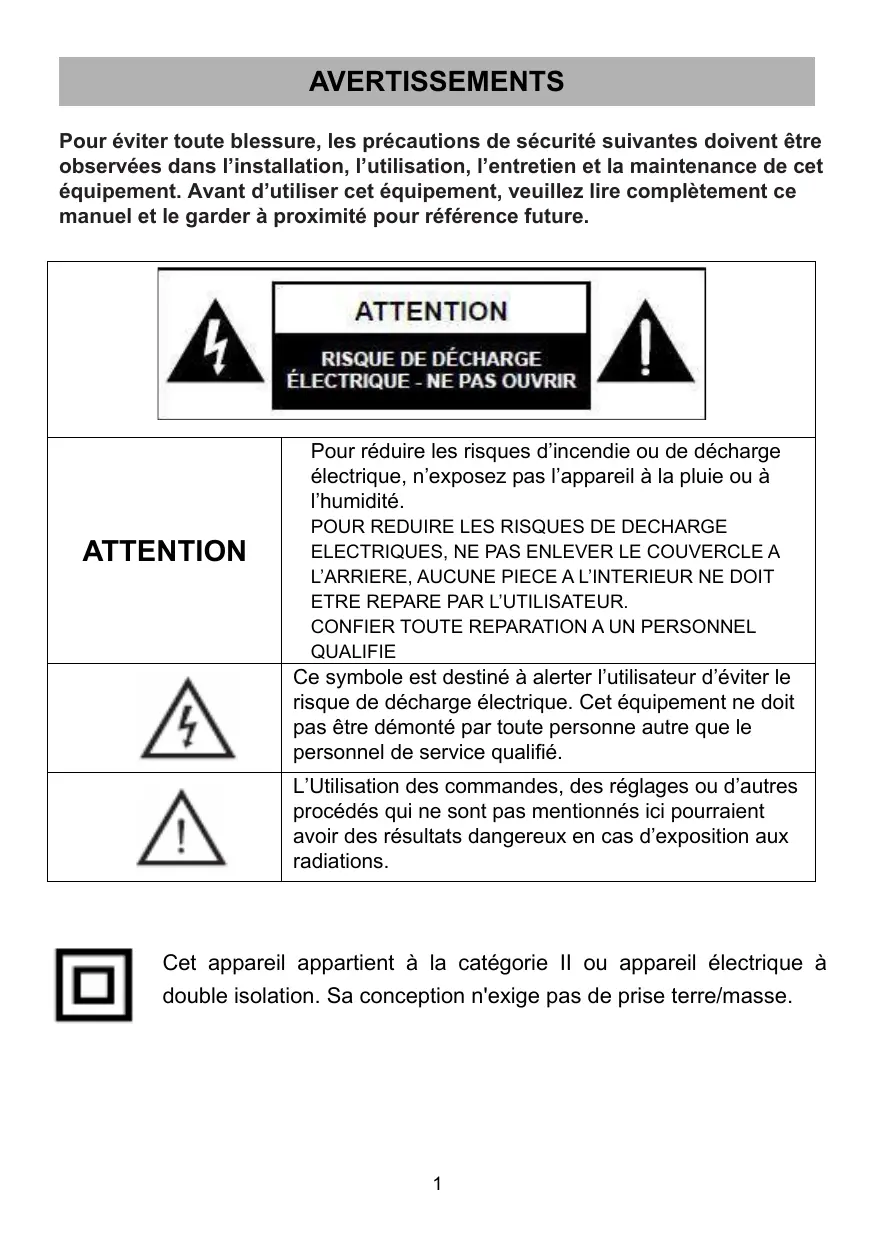 ATTENTION POUR REDUIRE LES RISQUES DE DECHARGE ELECTRIQUES, NE PAS ENLEVER LE COUVERCLE A L’ARRIERE, AUCUNE PIECE A L’INTERIEUR NE DOIT ETRE REPARE PAR L’UTILISATEUR.