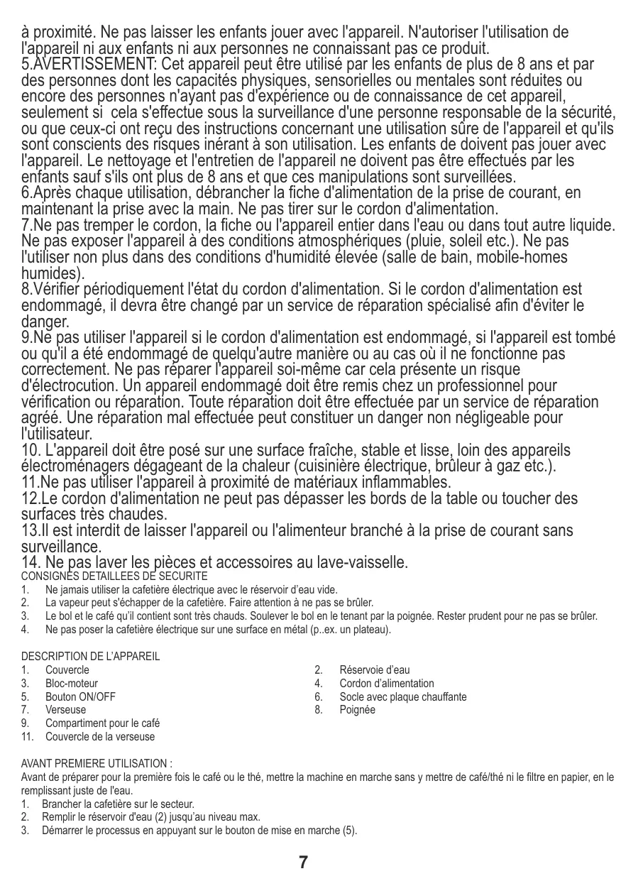 5.AVERTISSEMENT: Cet apparéil peut être utilisé par les enfants de plus de 8 ans et par des personnes dont les capacities physiques, sensorielles ou mentalles sont réduites ou encore des personnes n'ayant pas d'expérience ou de connaissance de cet apparéil, seulement si cela s'effectue sous la surveillance d'une personne responsable de la sécurité, ou que ceux-ci ont reçu des instructions concernant une utilisation sure de l' apparéil et qu'ils sont conscients des risques inérant à son'utilisation. Les enfants de doivent pas jouer avec l' apparéil. Le nettoyage et l'entretien de l' apparéil ne doit pas être effectués par les enfants sauf s'ils ont plus de 8 ans et que ces manipulations sont surveillées.