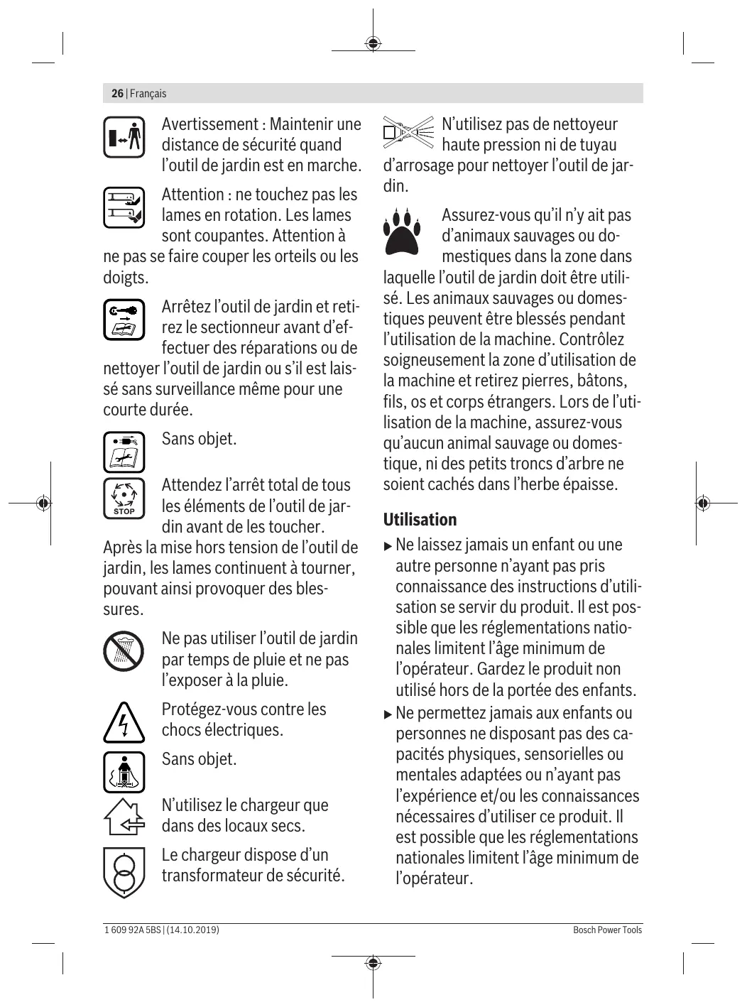 distance de sécurité quand l’outil de jardin est en marche. Attention : ne touchez pas les lames en rotation. Les lames sont coupantes. Attention à ne pas se faire couper les orteils ou les doigts. Arrêtez l’outil de jardin et retirez le sectionneur avant d’effectuer des réparations ou de nettoyer l’outil de jardin ou s’il est laissé sans surveillance même pour une courte durée. Sans objet. Attendez l’arrêt total de tous les éléments de l’outil de jardin avant de les toucher. Après la mise hors tension de l’outil de jardin, les lames continuent à tourner, pouvant ainsi provoquer des blessures. Ne pas utiliser l’outil de jardin par temps de pluie et ne pas l’exposer à la pluie. Protégez-vous contre les chocs électriques. Sans objet. N’utilisez le chargeur que dans des locaux secs. Le chargeur dispose d’un transformateur de sécurité. 1 609 92A 5BS | (14.10.2019) N’utilisez pas de nettoyeur haute pression ni de tuyau d’arrosage pour nettoyer l’outil de jardin. Assurez-vous qu’il n’y ait pas d’animaux sauvages ou domestiques dans la zone dans laquelle l’outil de jardin doit être utilisé. Les animaux sauvages ou domestiques peuvent être blessés pendant l’utilisation de la machine. Contrôlez soigneusement la zone d’utilisation de la machine et retirez pierres, bâtons, fils, os et corps étrangers. Lors de l’utilisation de la machine, assurez-vous qu’aucun animal sauvage ou domestique, ni des petits troncs d’arbre ne soient cachés dans l’herbe épaisse. Utilisation u Ne laissez jamais un enfant ou une autre personne n’ayant pas pris connaissance des instructions d’utilisation se servir du produit. Il est possible que les réglementations nationales limitent l’âge minimum de l’opérateur. Gardez le produit non utilisé hors de la portée des enfants. u Ne permettez jamais aux enfants ou personnes ne disposant pas des capacités physiques, sensorielles ou mentales adaptées ou n’ayant pas l’expérience et/ou les connaissances nécessaires d’utiliser ce produit. Il est possible que les réglementations nationales limitent l’âge minimum de l’opérateur. Bosch Power Tools Français | 27 Les enfants doivent être surveillés pour s’assurer qu’ils ne jouent pas avec le produit. u N’utilisez jamais l’outil de jardin lorsque des personnes, en particulier des enfants ou des animaux domestiques, se trouvent à proximité. u L’utilisateur de la tondeuse est responsable des accidents et des dommages causés à autrui ou à leurs biens. u Ne portez pas de chaussures en caoutchouc ouverts ou des sandalettes quand vous utilisez le produit. Portez toujours des chaussures fermées et des pantalons longs. u Inspectez soigneusement la surface à travailler et éliminez pierres, bâtons, fils métalliques, os et autres corps étrangers. u Avant de mettre l’appareil en marche, contrôlez toujours si les lames, les vis des lames et le sousgroupe de coupage ne sont pas usés ou endommagés. Remplacez les lames usées ou endommagées toujours en même temps que les vis des lames pour éviter tout balourd. u Ne tondez que de jour ou sous un bon éclairage artificiel. u Ne travaillez pas avec la tondeuse à gazon dans des conditions météorologiques défavorables et plus particulièrement en cas d’approche d’orage. u Si possible, n’utilisez pas l’outil de jardin lorsque l’herbe est mouillée.