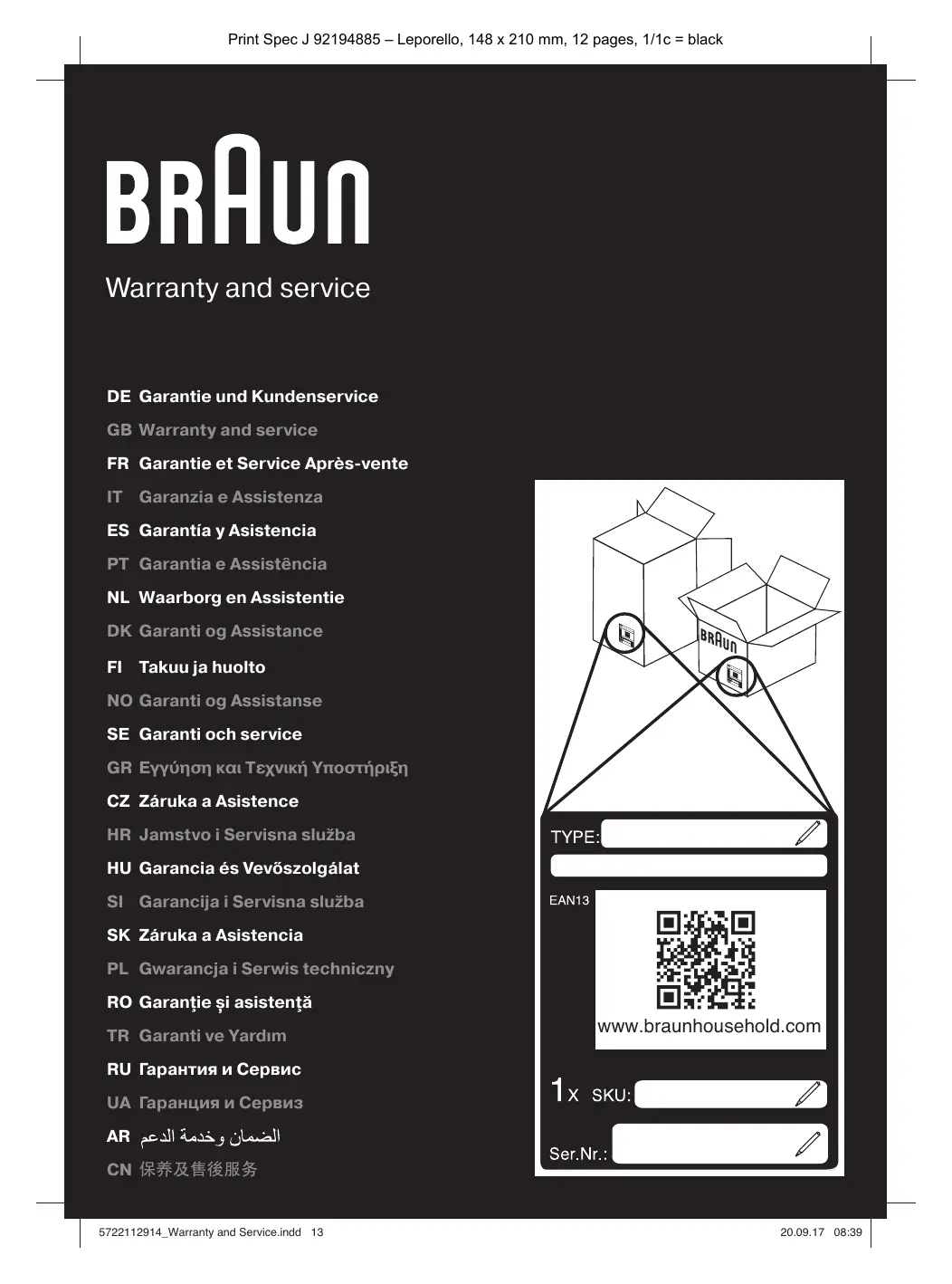 Deutsch (nur Deutschland) English Garantie Wir beglückwünschen Sie zum Kauf Ihres Gerätes und bedanken uns für das in unser Unternehmen gesetzte Vertrauen. Zusätzlich zu den gesetzlichen Gewährleistungsrechten, die in dem Land gelten, in dem das Produkt gekauft wurde, ist dieses Produkt durch eine Herstellergarantie („Garantie“) abgedeckt. Ihre gesetzlichen Rechte bei Mängeln gegenüber dem Händler, bei dem Sie dieses Produkt gekauft haben, werden durch diese Garantie nicht eingeschränkt. Die Garantieerklärung für das Land, in dem Sie dieses Produkt gekauft haben, finden Sie unter http://www.braunhousehold.com/de-de. Gerne können Sie bei unserer Service-Line unter Telefon 01805 000 502 (0,14 €/min aus dem deutschen Festnetz; max. 0,42 €/min aus dem Mobilfunknetz) auch eine Garantieerklärung in Textform anfordern. Es gelten ausschließlich die in der Garantieerklärung aufgeführten Garantiebedingungen. Wenn an Ihrem Produkt während des Garantiezeitraums ein von der Garantie abgedeckter Mangel auftritt, der die Eignung des Produkts zur gewöhnlichen Verwendung beseitigt oder vermindert, oder wenn das Produkt nicht die übliche Beschaffenheit hat, wenden Sie sich bitte an den Händler, bei dem Sie dieses Produkt gekauft haben, oder an unsere Service-Line unter Telefon 01805 000 502 (0,14 €/min aus dem deutschen Festnetz; max. 0,42 €/min aus dem Mobilfunknetz). Warranty Congratulations on your recent purchase. We appreciate the confidence you have placed in our brand. This product is covered by a warranty which complies with all statutory regulations regarding warranty on consumer goods and consumer rights in force in the country where the product was purchased. If your product does not conform to the sales description, has defects or malfunctions, is not suitable for the purpose it is intended for or lacks the quality and performance promised or to be reasonably expected from it you can either (i) consult the product retailer, or (ii) contact our appropriate Customer Service directly as indicated below, or alternatively (iii) deliver the product to an authorised Service Centre. You can find more details on Authorised Service Centres on the website www.braunhousehold.com, or on the specific website of the country where you live, which will enable you to locate the centre nearest to you. Mit freundlichen Grüßen Braun Household Ihr After Sales Service-Team Deutsch (nur Österreich und Schweiz) Garantie Wir bedanken uns für Ihren Einkauf und für das Vertrauen, das Sie damit unserer Marke entgegengebracht haben. Dieses Produkt verfügt über eine Garantie, die allen im Land, in dem das Produkt gekauft wurde, geltenden gesetzlichen Vorschriften betreffend, die Garantie von Konsumgütern, sowie betreffend den Rechten von Konsumenten nachkommt. Sollte Ihr Produkt nicht der Verkaufsbeschreibung entsprechen, Defekte oder Störungen aufweisen, nicht für den vorgesehenen Zweck geeignet sein, oder vernünftigerweise zu erwartenden Eigenschaften und Leistungen nicht aufweisen, können Sie sich sowohl (i) an den Händler des Produktes wenden, (ii) direkt unseren Kundenservice kontaktieren, der mit den in dieser Broschüre beschriebenen Modalitäten vertraut ist, oder alternativ dazu auch (iii) das Produkt zu einem von uns autorisierten Servicepartner bringen. Nähere Informationen zu den Servicepartnern finden Sie auf der Website www.braunhousehold.com/de-at oder www.braunhousehold.com/de-ch. Sincerely yours, The Braun Household After Sales Service Team Français Garantie Nous vous remercions de votre achat et de la confiance témoignée envers notre marque. Nous tenons à vous informer que ce produit est couvert par une garantie qui est parfaitement conforme à toutes les dispositions légales relatives à la garantie et aux droits des consommateurs existants dans le pays où le produit a été acheté. Les conditions d’application de cette garantie sont disponibles auprès de votre revendeur ainsi que sur notre site internet officiel. Au cas où ce produit ne serait pas conforme à sa description, présenterait des défauts ou des dysfonctionnements, ne conviendrait pas au but auquel il est destiné, ou ne présenterait pas les qualités et les performances promises ou auxquelles on pourrait raisonnablement s’attendre, vous pouvez soit :