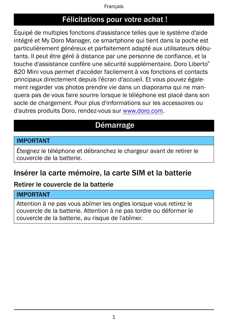 - Entretien et maintenance Français Félicitations pour votre achat ! Équipé de multiples fonctions d'assistance telles que le système d'aide intégré et My Doro Manager, ce smartphone qui tient dans la poche est particulièrement généreux et parfaitement adapté aux utilisateurs débutants. Il peut être géré à distance par une personne de confiance, et la touche d'assistance confère une sécurité supplémentaire. Doro Liberto 820 Mini vous permet d'accéder facilement à vos fonctions et contacts principaux directement depuis l'écran d'accueil. Et vous pouvez également regarder vos photos prendre vie dans un diaporama qui ne manquera pas de vous faire sourire lorsque le téléphone est placé dans son socle de chargement. Pour plus d'informations sur les accessoires ou d'autres produits Doro, rendez-vous sur www.doro.com. p. 69