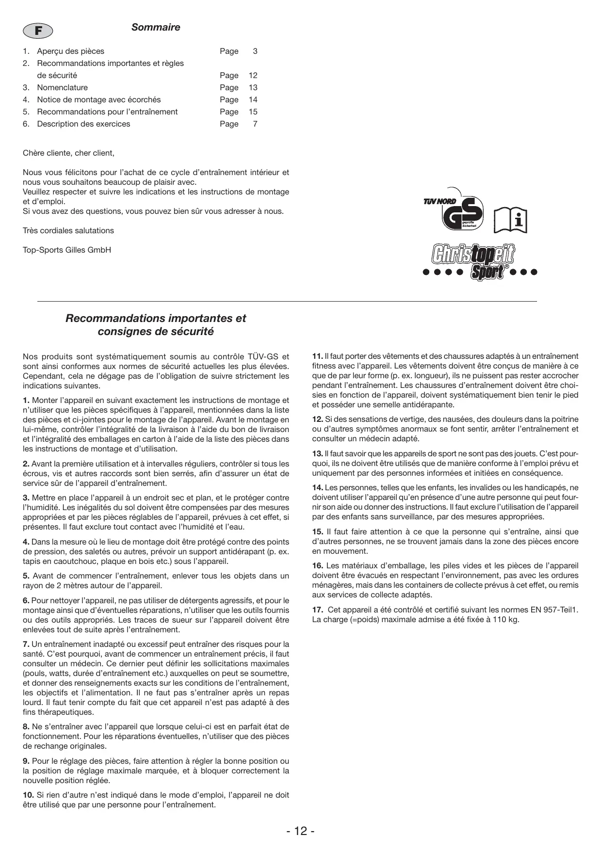Chère cliente, cher client, Nous vous félicitons pour l’achat de ce cycle d’entraînement intérieur et nous vous souhaitons beaucoup de plaisir avec. Veuillez respecter et suivre les indications et les instructions de montage et d’emploi. Si vous avez des questions, vous pouvez bien sûr vous adresser à nous. Très cordiales salutations Top-Sports Gilles GmbH Recommandations importantes et consignes de sécurité Nos produits sont systématiquement soumis au contrôle TÜV-GS et sont ainsi conformes aux normes de sécurité actuelles les plus élevées. Cependant, cela ne dégage pas de l’obligation de suivre strictement les indications suivantes.