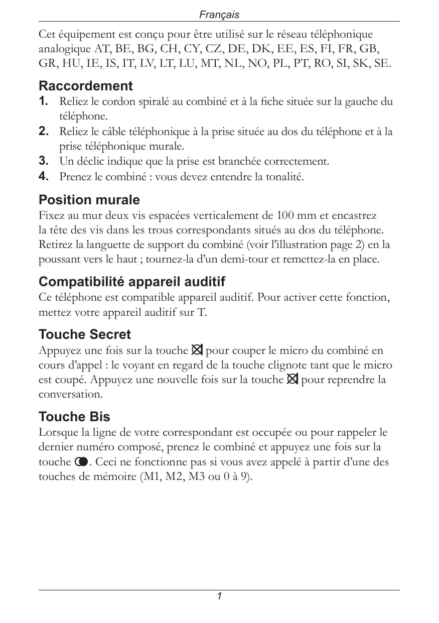 Position murale Fixez au mur deux vis espacées verticalement de 100 mm et encastrez la tête des vis dans les trous correspondants situés au dos du téléphone. Retirez la languette de support du combiné (voir l’illustration page 2) en la poussant vers le haut ; tournez-la d’un demi-tour et remettez-la en place. Compatibilité appareil auditif Ce téléphone est compatible appareil auditif. Pour activer cette fonction, mettez votre appareil auditif sur T. Touche Secret Appuyez une fois sur la touche z pour couper le micro du combiné en cours d’appel : le voyant en regard de la touche clignote tant que le micro est coupé. Appuyez une nouvelle fois sur la touche z pour reprendre la conversation. Touche Bis Lorsque la ligne de votre correspondant est occupée ou pour rappeler le dernier numéro composé, prenez le combiné et appuyez une fois sur la touche r . Ceci ne fonctionne pas si vous avez appelé à partir d’une des touches de mémoire (M1, M2, M3 ou 0 à 9).