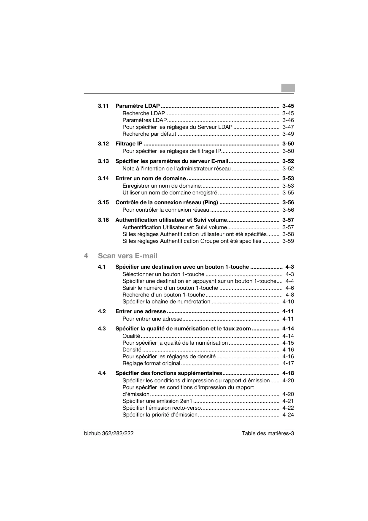 Paramètres SMTP 3-19 Adresse du serveur SMTP 3-20 Adresse E-mail 3-22 Nom Utilisateur AUTH SMTP 3-23 Mot de passe Authentification SMTP 3-24