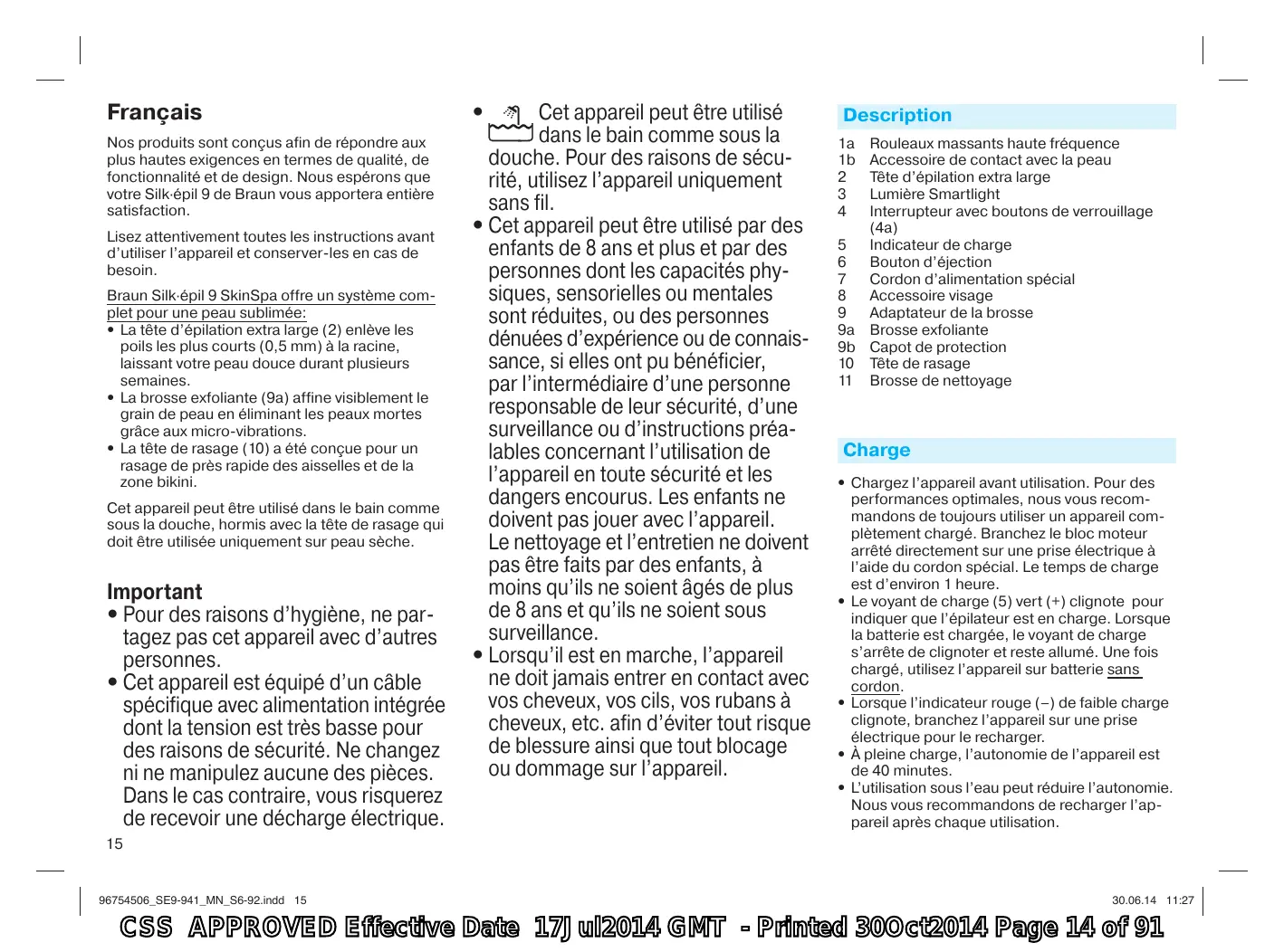 96754506_SE9-941_MN_S6-92.indd 17 avez des doutes concernant l’utilisation de cet appareil, consultez votre médecin. Une consultation chez le médecin est nécessaire avant toute utilisation de cet appareil dans les cas suivants : eczéma, coupures, réactions inflammatoires de la peau telles qu’une folliculite (follicules pileux purulents) et varices autour de grains de beauté, immunité réduite de la peau, par exemple, en cas de diabète non insulinodépendant, de grossesse, de maladie de Raynaud, d’hémophilie, de candida ou de déficit immunitaire. II Exfoliation Quelques conseils utiles La brosse exfoliante (9a) a été développée pour un usage sur tout le corps, et plus particulièrement pour les jambes, les bras et le décolleté. Elle n’a pas été conçue pour une utilisation sur le visage. L’action de brossage en douceur avec plus de 3000 micro-vibrations par minute retire efficacement les peaux mortes pour une peau visiblement plus belle. Vous pouvez utiliser la brosse exfoliante de façon hebdomadaire sur une peau sèche ou humide pendant votre douche. Cependant, quand vous l’utilisez dans le bain, ne l’immergez pas entièrement sous l’eau sinon elle n’aura pas une performance d’exfoliation maximale. Utiliser la brosse sur peau humide procure des résultats d’exfoliation 4 fois supérieurs à un produit exfoliant appliqué manuellement et seul. Pour de meilleurs résultats d’exfoliation, plus de confort et une expérience agréable, nous vous recommandons d’utiliser la brosse exfoliante sur peau humide avec l’exfoliant de votre choix ou du gel douche. Comment exfolier Fixez la brosse exfoliante (9a) sur l’adaptateur (9). Fixez l’adaptateur sur l’appareil. A Sélectionnez la vitesse « I » pour les zones sensibles et la vitesse « II » pour les autres zones. B Passez doucement la brosse exfoliante en mouvements circulaires sur votre peau pour affiner le grain de peau en douceur. Evitez de maintenir la brosse sur la même zone pendant une durée prolongée. N’utilisez pas la brosse exfoliante sur votre visage. L’utilisation régulière de la brosse exfoliante (ex : une fois par semaine) aide à limiter le risque de poils incarnés : les cellules mortes sont retirées permettant ainsi aux poils fins de ne pas rester bloqués sous la peau. Nous vous recommandons de vous exfolier au moins 1 à 2 jours avant de vous épiler. C Nettoyage de la brosse exfoliante Apres utilisation, rincez la brosse exfoliante sous l’eau. Vous pouvez utiliser du savon liquide si besoin. Secouez la brosse pour égoutter l’excès d’eau et laissez-la sécher. Placez le capot de protection (9b) avant de ranger la brosse. D Remplacer la brosse exfoliante Lors d’une utilisation hebdomadaire, nous vous recommandons de remplacer la brosse (9a) au bout de 12 mois. Les recharges de brosse (ref. no. 79 Spa) sont disponibles chez votre revendeur ou dans le Centres Service Agrées Braun ou via www.service.braun.com. III Utilisation de la tête rasoir La tête rasoir (10) est conçue pour un rasage rapide de près des jambes, aisselles, et zone bikini, tondre des contours et tondre les poils à 5 mm de longueur. Avec la tête de rasage, utilisez l’appareil seulement sur peau sèche et avec la vitesse réglée à « II ».