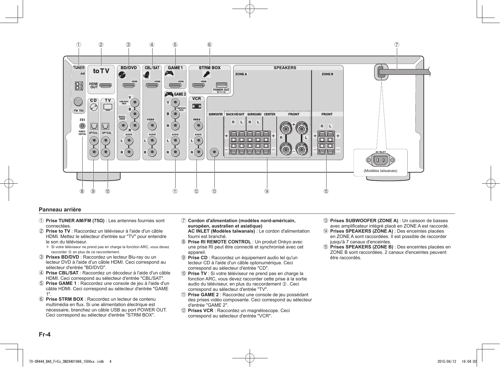 2015/04/12 16:04:03 Étape 1 : Connexions Caractéristiques des types d'enceinte 3 Pour raccorder les enceintes "# émettent des sons stéréo avant et $ émet des sons au centre tels que les dialogues et les voix. %& produit un champ sonore arrière. ' reproduit les sons de basse et crée un champ sonore riche. Le branchement des enceintes 78, 9F, ou des enceintes GH permet de lire avec la configuration 7.1. Les enceintes 78 (arrière) améliorent l'impression d'enveloppement créé par le champ sonore arrière ainsi que l'homogénéité des sons arrière, offrant des expériences sonores plus naturelles dans le champ sonore. Les enceintes 9F et GH (en hauteur) produisent des effets surround sur une hauteur plane. Notez que cet appareil peut effectuer un traitement optimal du champ sonore pour le type d'enceintes en hauteur réellement installé et mémorisé dans les réglages d'enceinte automatiques. Raccordement ZONE A