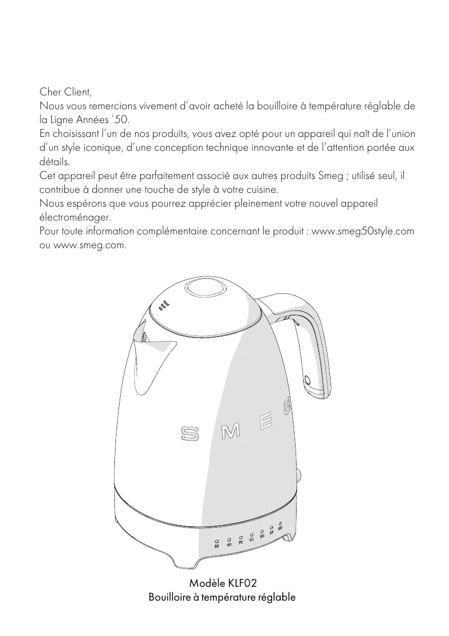 FERVEDOR ELÉTRICO DE TEMPERATURA VARIÁVEL Cher Client, Nous vous remercions vivement d’avoir acheté la bouilloire à température réglable de la Ligne Années ’50. En choisissant l’un de nos produits, vous avez opté pour un appareil qui naît de l’union d’un style iconique, d’une conception technique innovante et de l’attention portée aux détails. Cet appareil peut être parfaitement associé aux autres produits Smeg ; utilisé seul, il contribue à donner une touche de style à votre cuisine. Nous espérons que vous pourrez apprécier pleinement votre nouvel appareil électroménager. Pour toute information complémentaire concernant le produit : www.smeg50style.com ou www.smeg.com. Modèle KLF02 Bouilloire à température réglable Sommaire