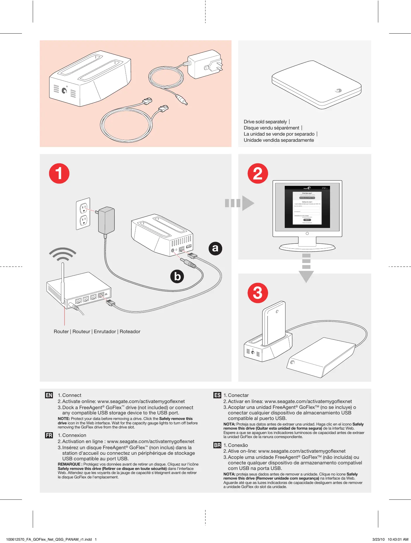 station d'accueil ou connectez un périphérique de stockage USB compatible au port USB. REMARQUE : Protégez vos données avant de retirer un disque. Cliquez sur l'icône Safely remove this drive (Retirer ce disque en toute sécurité) dans l'interface Web. Attendez que les voyants de la jauge de capacité s'éteignent avant de retirer le disque GoFlex de l'emplacement. 100612570_FA_GOFlex_Net_QSG_PANAM_r1.indd 1 ES 1. Conectar