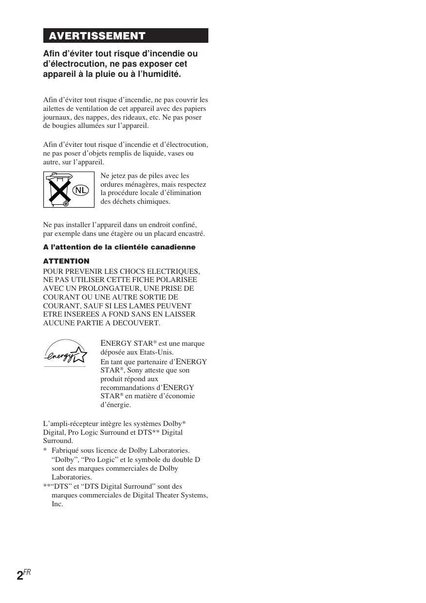 AVERTISSEMENT Afin d’éviter tout risque d’incendie ou d’électrocution, ne pas exposer cet appareil à la pluie ou à l’humidité. Afin d’éviter tout risque d’incendie, ne pas couvrir les ailettes de ventilation de cet appareil avec des papiers journaux, des nappes, des rideaux, etc. Ne pas poser de bougies allumées sur l’appareil. Afin d’éviter tout risque d’incendie et d’électrocution, ne pas poser d’objets remplis de liquide, vases ou autre, sur l’appareil. Ne jetez pas de piles avec les ordures ménagères, mais respectez la procédure locale d’élimination des déchets chimiques. Ne pas installer l’appareil dans un endroit confiné, par exemple dans une étagère ou un placard encastré. A l’attention de la clientéle canadienne ATTENTION POUR PREVENIR LES CHOCS ELECTRIQUES,