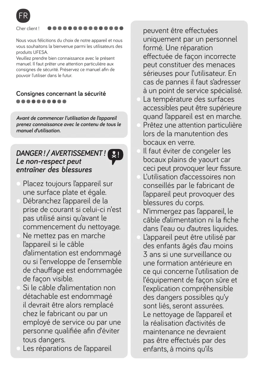 à un point de service spécialisé. ●●La température des surfaces accessibles peut être supérieure quand l’appareil est en marche. ●●Prêtez une attention particulière lors de la manutention des bocaux en verre. ●●Il faut éviter de congeler les bocaux plains de yaourt car ceci peut provoquer leur fissure. ●●L’utilisation d’accessoires non conseillés par le fabricant de l’appareil peut provoquer des blessures du corps. ●●N’immergez pas l’appareil, le câble d’alimentation ni la fiche dans l’eau ou d’autres liquides. ●●L’appareil peut être utilisé par des enfants âgés d’au moins 3 ans si une surveillance ou une formation antérieure en ce qui concerne l’utilisation de l’équipement de façon sûre et l’explication compréhensible des dangers possibles qu’y sont liés, seront assurées. Le nettoyage de l’appareil et la réalisation d’activités de maintenance ne devraient pas être effectués par des enfants, à moins qu’ils