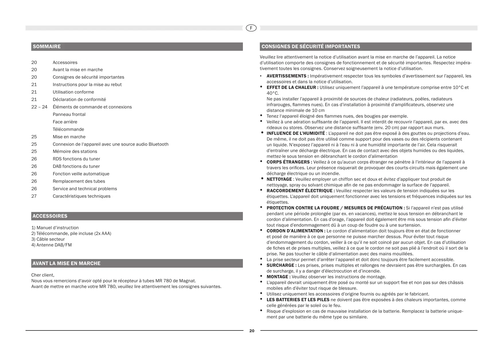 Cher client, Nous vous remercions d‘avoir opté pour le récepteur à tubes MR 780 de Magnat. Avant de mettre en marche votre MR 780, veuillez lire attentivement les consignes suivantes.