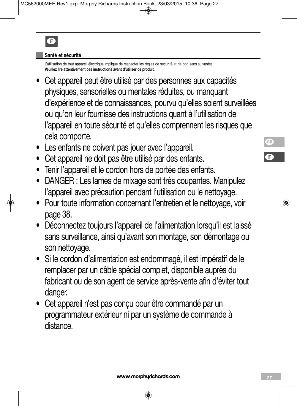 Les produits Morphy Richards sont conçus pour unusage exclusivement domestique. Voir les limitations d’usage dans le sous-titre Positionnement des Consignes de sécurité importantes. Morphy Richards s’engage à mener une politique d’amélioration continue en termes de qualité et de conception. Le fabricant se réserve donc le droit de modifier sans préavis la spécification de ses modèles. Glen Dimplex France Zl Petite Montagne Sud 12 rue des Cevennes 91017 EVRY - LISSES Cedex www.glendimplex.fr T : + 33 (0)1 69 11 11 91
